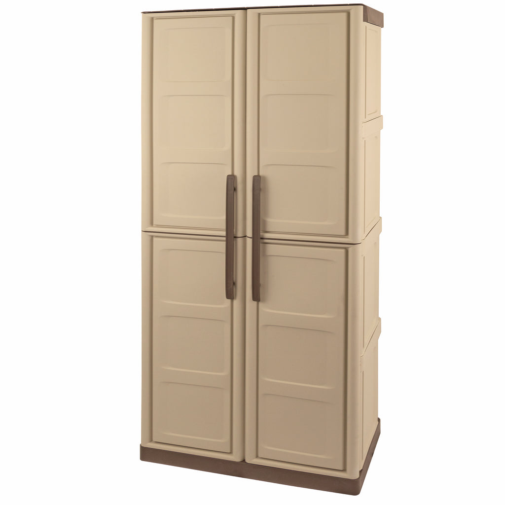 Excellent Large Storage Cupboard with Shelving & Broom Storage. Made from strong, virtually maintenance free polypropylene this cupboard is built to last. Ideal for storing your Tools, Cleaning Utensils, Soaps, Detergents, Animal Feed even Paints and Decorating Materials. It will not rot, it requires no treatment and is UV resistant. Delivered flatpacked for very easy assembly. Ideal for use in your Garage, Utility Room, Porch, Car Port, Shed, Workshop or other sheltered location.