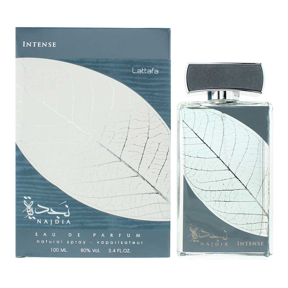 Lattafa Najdia Intense is a fruity aromatic fragrance for men launched in 2024. Top notes consist if sparkling apple, pineapple, ginger and mint. Middle notes are soft and floral lavender, geranium with fresh marine notes. Base notes are tonka bean musk patchouli and sandalwood.
