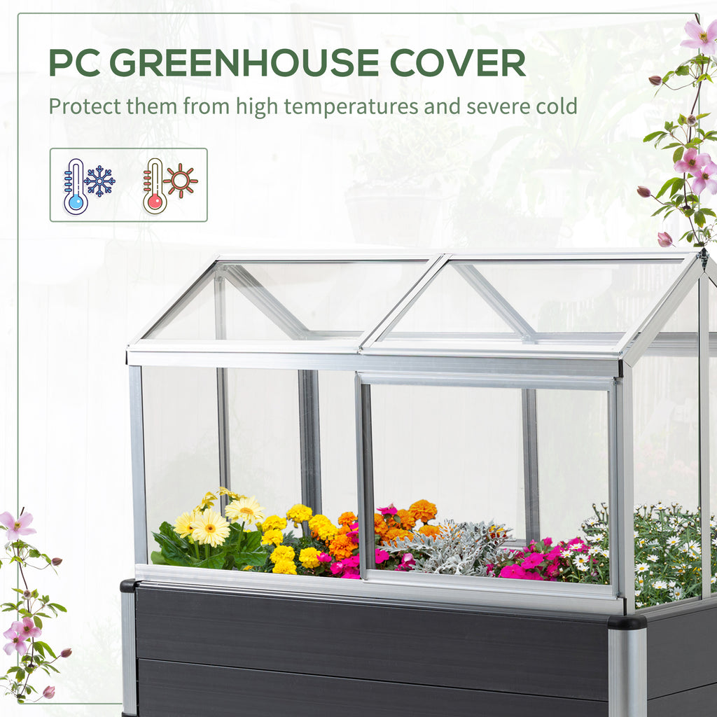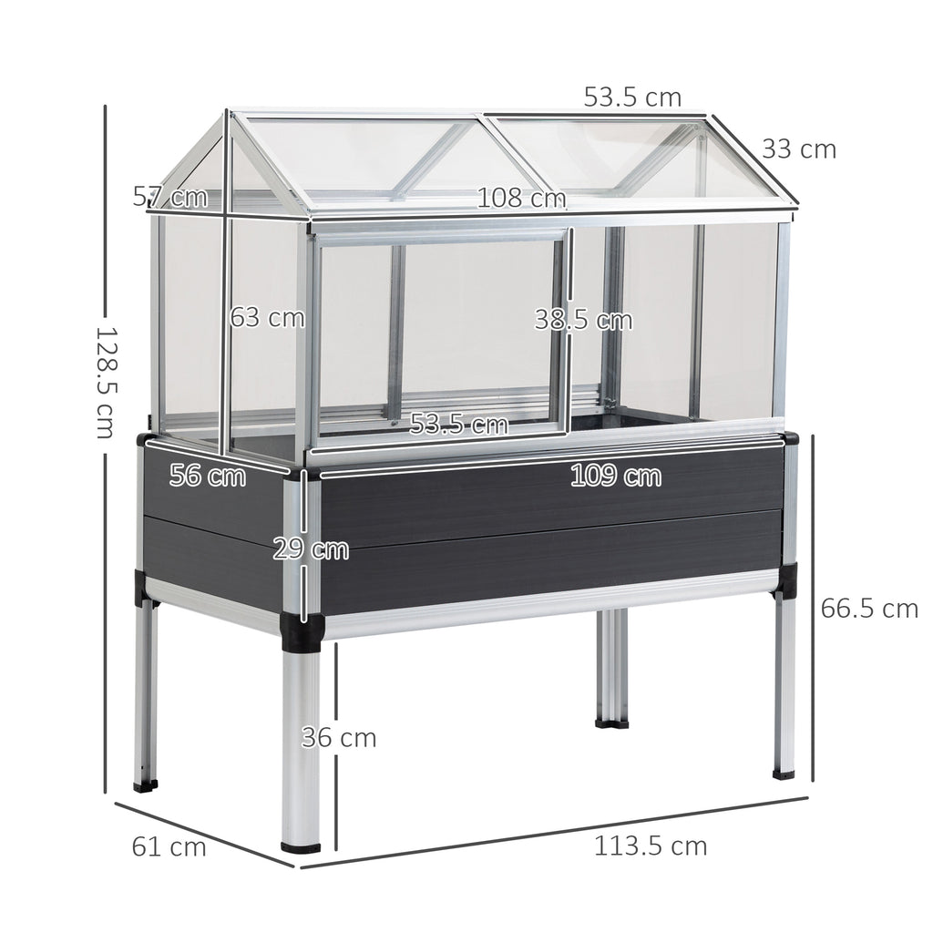 A planter box is the better way to grow plants and vegetables at home. Our Outsunny raised garden bed makes it easy to take care of your plants today. This garden box keeps weeds away from your soil and prevents soil compaction. It features a PC cover as a greenhouse to protect them from high temperatures and severe cold. Check out this plant bed from Outsunny, and start your best garden. Features: - Raised plant bed gives you ample space to place your plants and help them grow proficiently. - PC greenhouse cover protects plants from high temperatures or severe cold. - 4 skylights can be opened for getting better sunlight. - Movable windows for good air ventilation. - Aluminum frame ensures great stability. - Assembly required. Specification: - Color: Grey. - Material: Aluminum Frame, PVC, PC. - Overall Dimension: 113.5L x 61W x 128.5Hcm. - Bed Dimension: 113.5L x 61W x 66.5Hcm' - Interior Bed Dimension: 109L x 56W x 29Hcm. - Greenhouse Dimension: 108L x 57W x 63Hcm. - Scuttle Size: 53.5W x 33Hcm. - Movable Window Size: 53.5W x 38.5Hcm. - Weight Capacity: 50kg. - Windproof Rating: Level 4. - Item Label: 845-596. 113x61CM OPEN PLANTING AREA: Spacious design where you can grow vegetables, flowers, fruits and more any way you want to. Elevated design is easy POLYCARBONATE PANELS: Thick plastic shell protects inside from other weather, also holds heat inside - great for the cold seasons. FOUR WINDOWS: Opens with enough room to allow air inside and out, helping to encourage growth. ALUMINIUM FRAME: A strong and naturally corrosion-resistant structure. DIMENSIONS: 128.5H x 113.5L x 61Wcm. Inner: 29H x 109L x 56Wcm. MAXIMUM LOAD 50KG. ASSEMBLY REQUIRED.