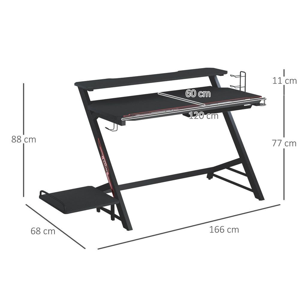 - PRODUCT INFORMATION: Overall dimension: 166L x 68W x 88H cm; Table top dimension: 120L x 60W cm. Weight capacity: desktop: 30kg, upper board and host support board:10kg, headphone hanger, gamepad holder, cup holder, cable box: 1.5kg.