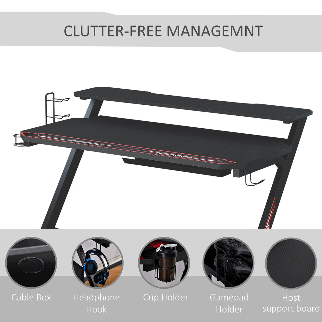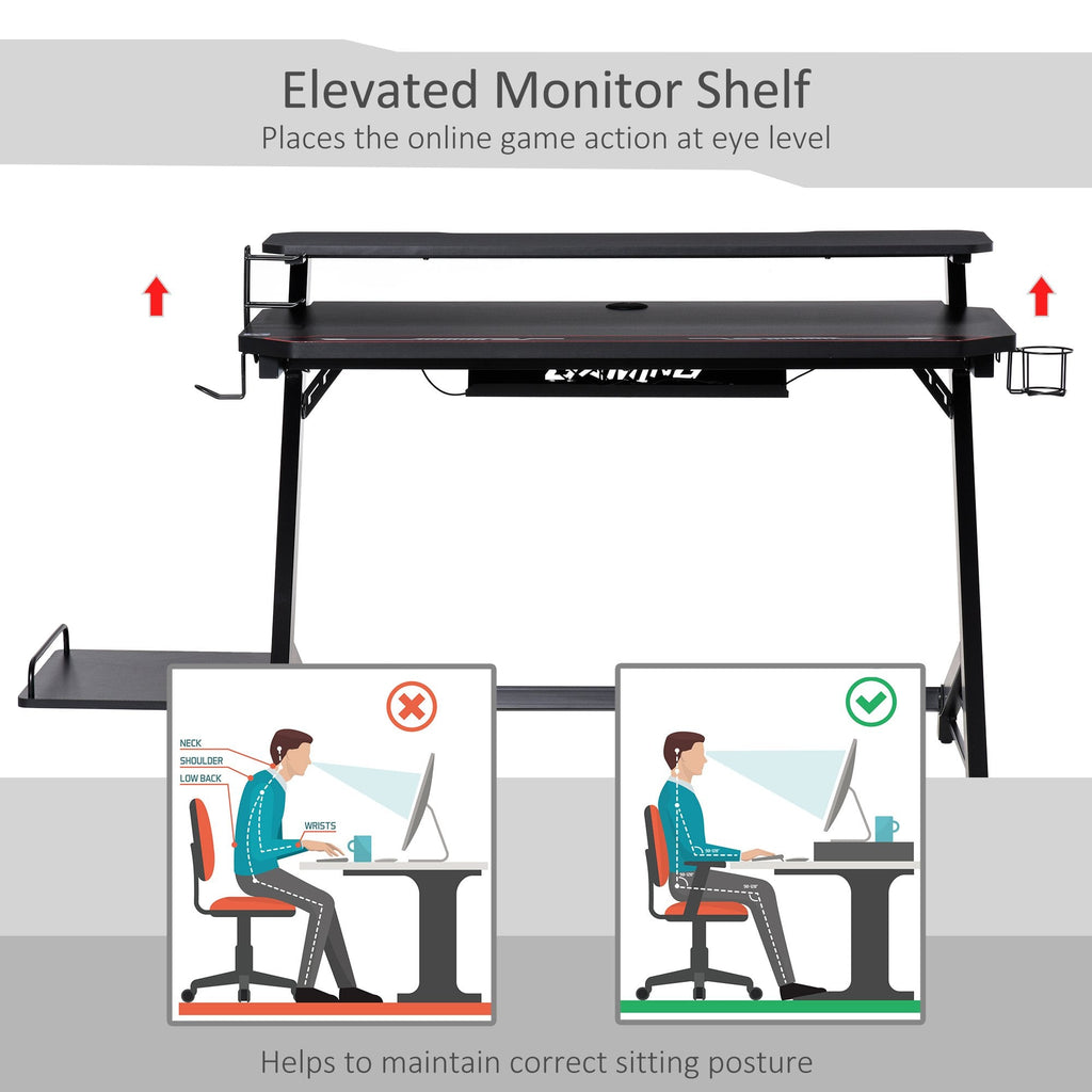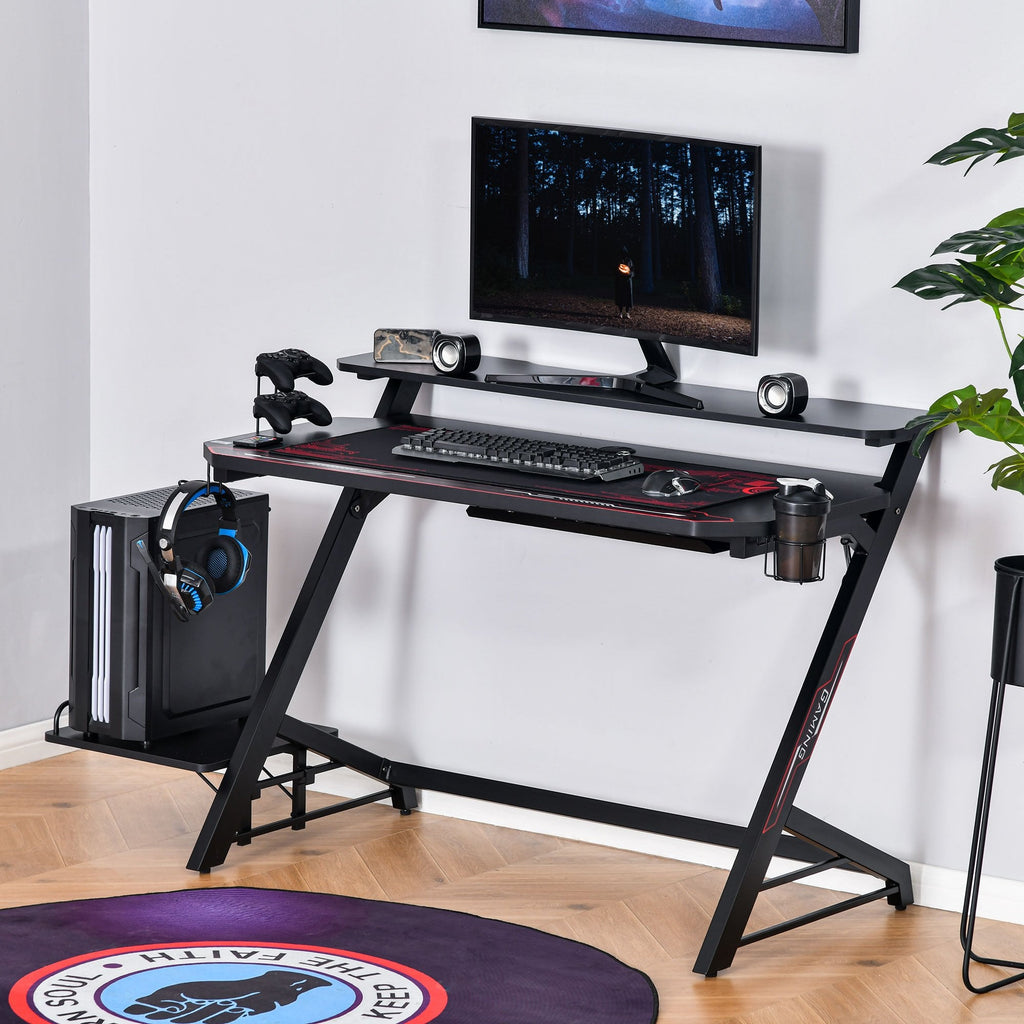 Attention to detail wins games, and trust that this ergonomic gaming desk is built to win. Our HOMCOM computer desk features a large desktop to place your electronic devices or other necessities, keeping you engaged in the game. This office desk features built-in support for all your gaming hardware, providing solutions for your headphones, monitors, and drinks. This gamer desk can seamlessly take you from a workstation to a battle station.