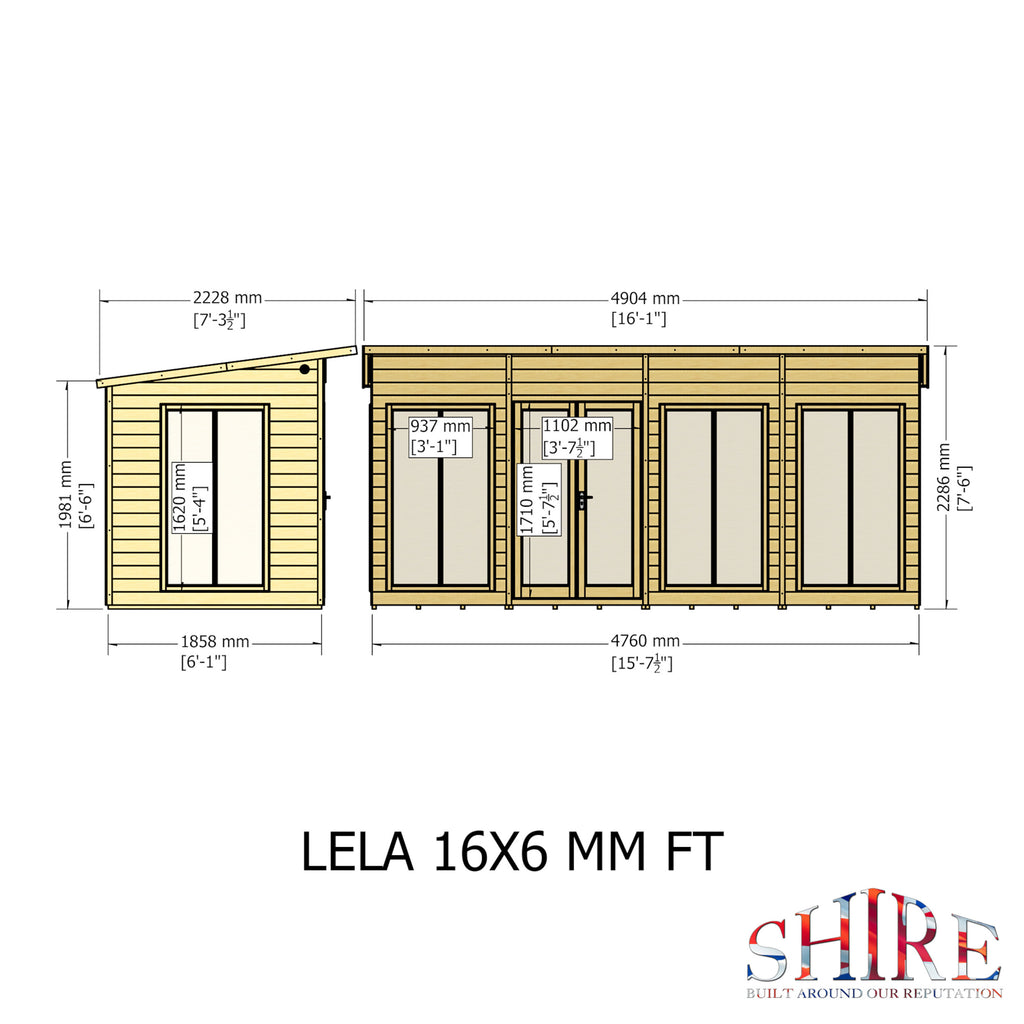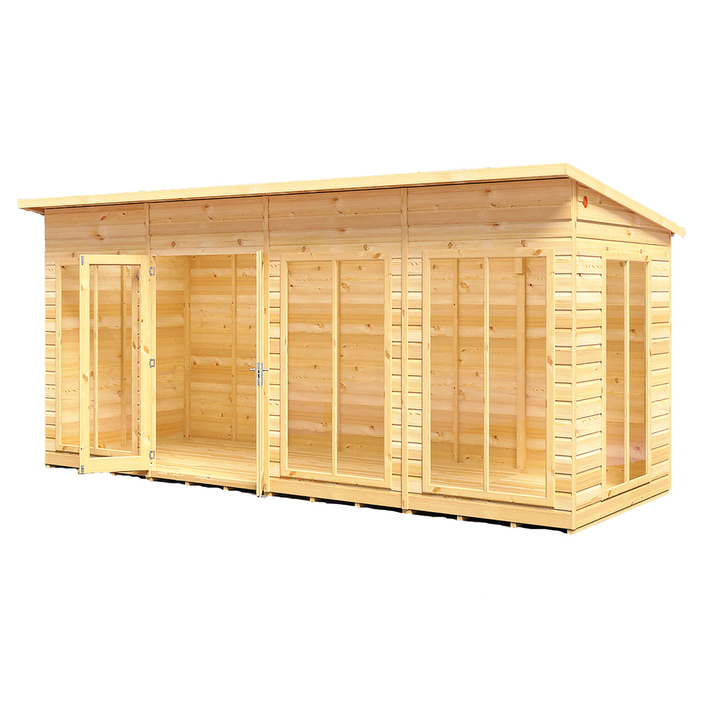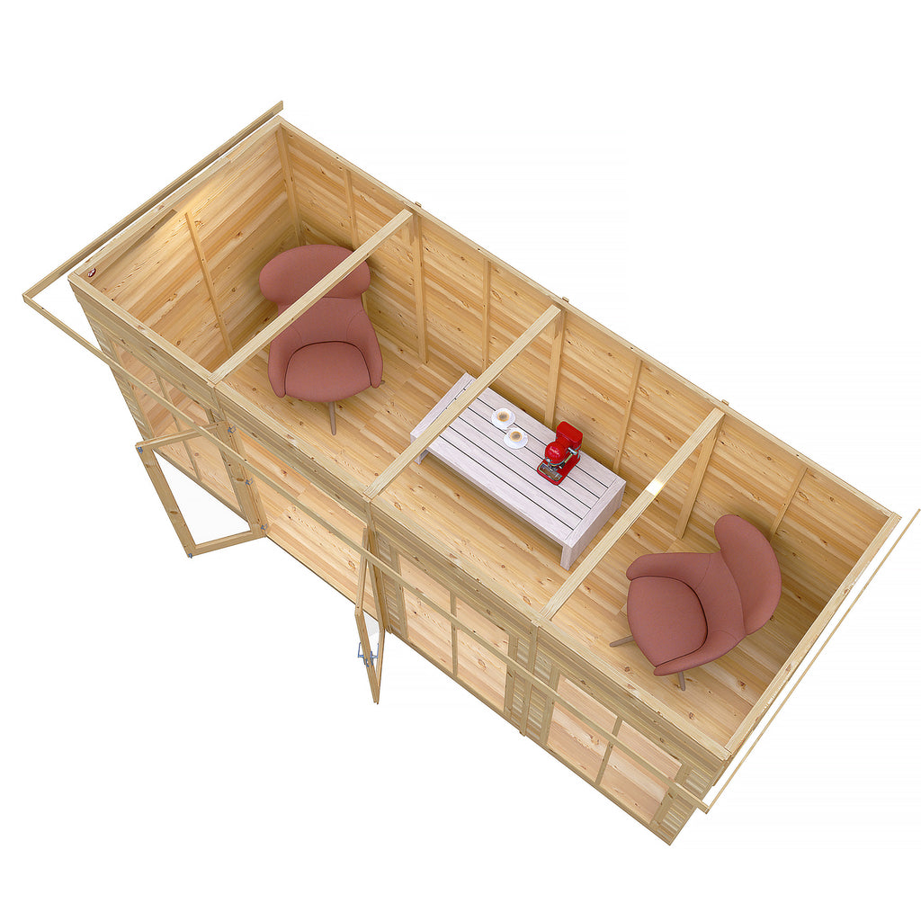 The stylish Lela Summerhouse is a valuable addition to your outdoor living - this modern garden room is perfect for summer dining and relaxing. With an eaves height of around 7 ft high, the Lela provides a very comfortable, spacious interior. The joinery made double doors are fitted with a mortice lock. The windows are fixed and all glazing is acrylic for your safety. The building is constructed on 34 mm square framing and clad with planed shiplap tongue and groove boards made only from the highest grade, FSC approved, slow grown pine. The floor and roof are 12mm matching T&G boards and the roof comes with roof felt supplied. Dipped base coat preservative ready for you to top coat.