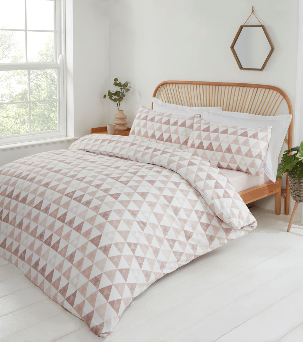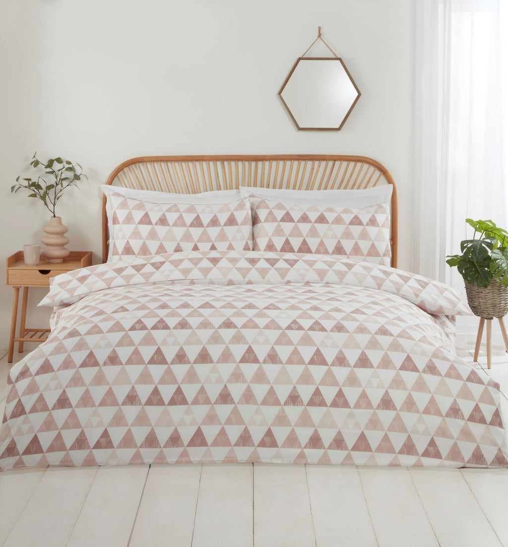 Lewis’s printed bed in a bag comprises of everything you need to refresh your bed, containing a fitted sheet, duvet cover and matching pillowcases. Essential bedding comes in a pink geometric triangle design, this modern design will suit a variety of bedrooms. The microfibre duvet set is hardwearing but soft, great for a comfortable night’s sleep. The microfibre material is practical and easy to care for as it is machine washable and tumble drier friendly. // Lewis's printed bed in a bag is available in 3 sizes; single, double and king.