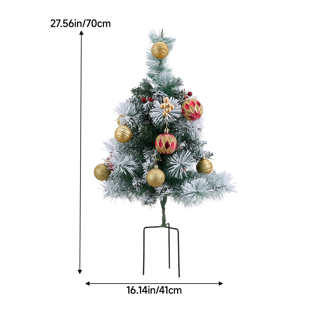 Enhance your outdoor festive decor with this 2-pack of Christmas trees, each featuring a sturdy metal tripod stake for easy placement in soil, planters, or floral foam. Decorated with pinecones, red berries, and traditional baubles, they boast lush, realistic pine-style foliage for instant seasonal charm. Compact and weather-resistant, these trees are ideal for gardens, porch planters, or entryways, bringing a cheerful touch of festive spirit to any outdoor setting.