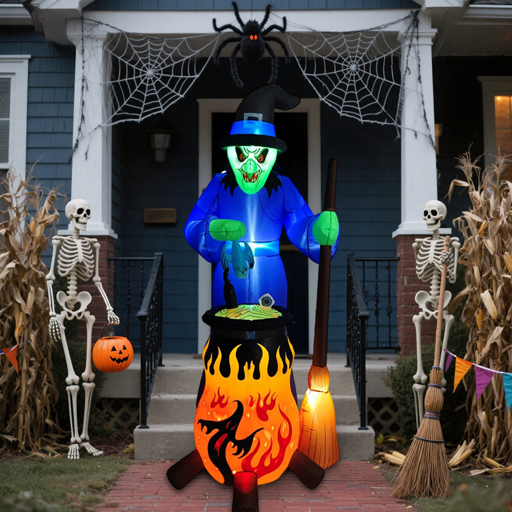 Enhance your Halloween with this inflatable witch, perfect for outdoor decoration. Featuring a classic spooky design with a long robe, pointed hat, and ghostly smile, it creates an eerie and mysterious atmosphere. The witch holds a broomstick and stands beside a cauldron, as if brewing a magical potion, adding to the storytelling and fun. Built-in white LED lights and a simulated flame effect give a captivating glow, making the scene come alive. Ideal for garden displays or haunted house setups, this inflatable witch is sure to become the centrepiece of your Halloween celebrations.