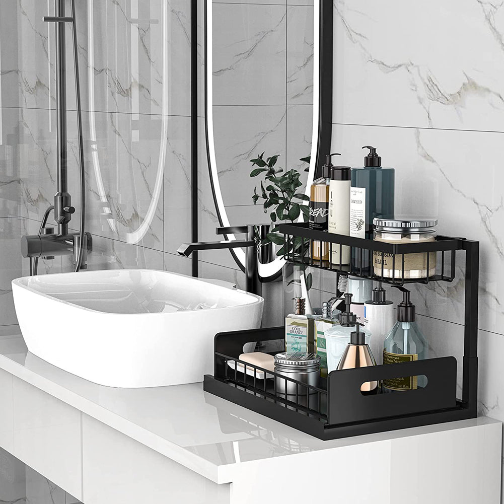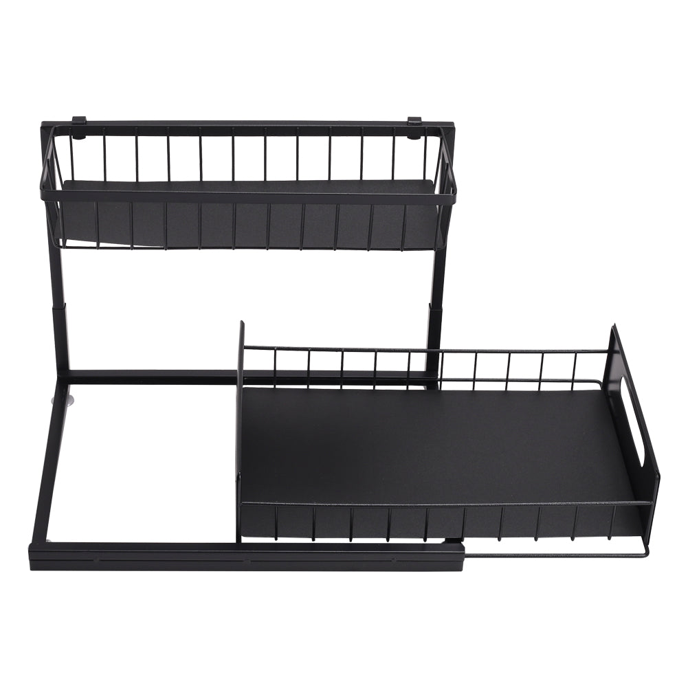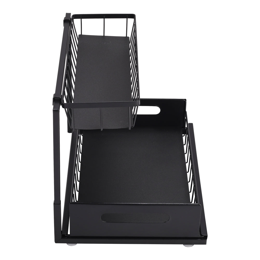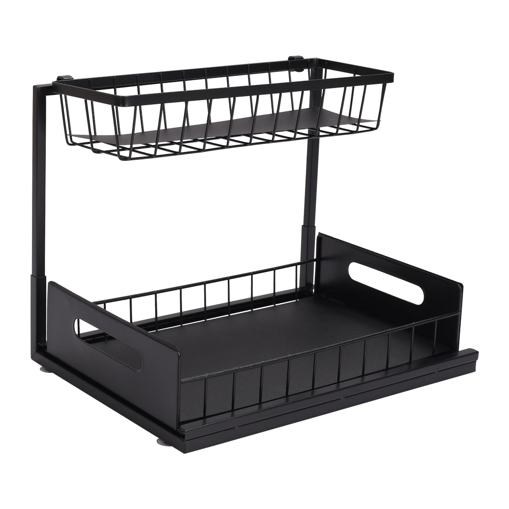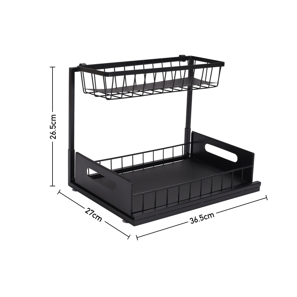The Black Carbon Steel Cabinet Rack offers a smart solution to keep your kitchen or bathroom neat and organised. Its narrow, space-saving design fits perfectly under sinks or in tight spaces. Equipped with suction cups, it remains stable while the drawer-style bottom basket allows easy access to items. Made of carbon steel with a baked enamel finish, it is strong, rust-resistant, and durable. Ideal for spices, toiletries, or general storage, it adds versatility to any room.