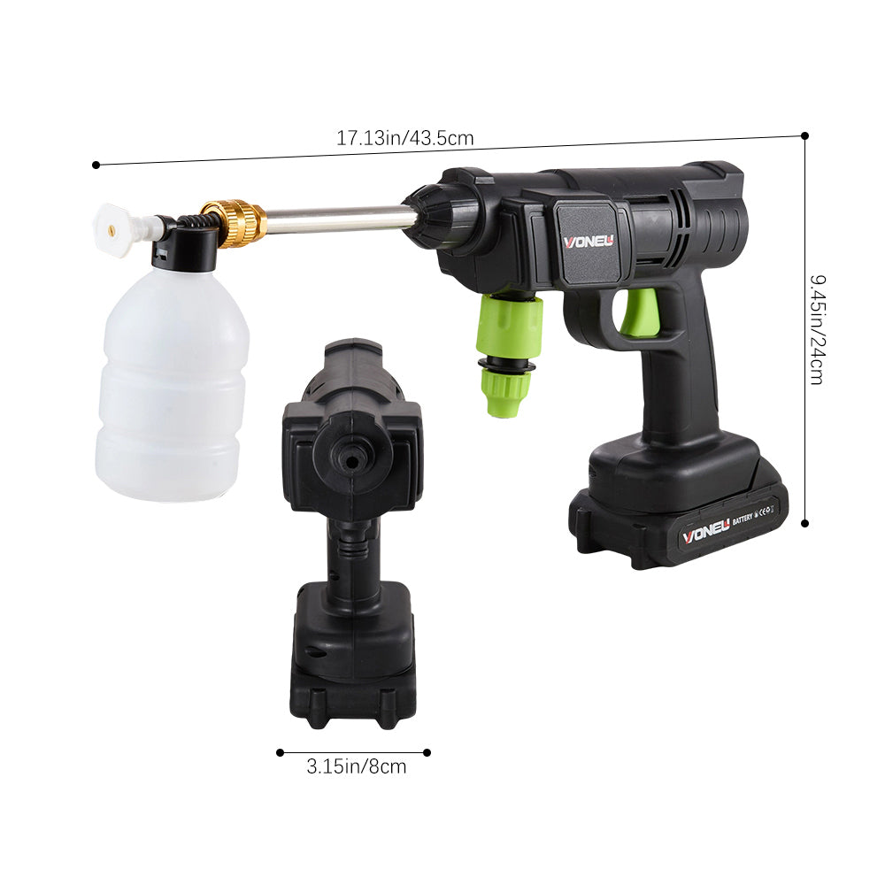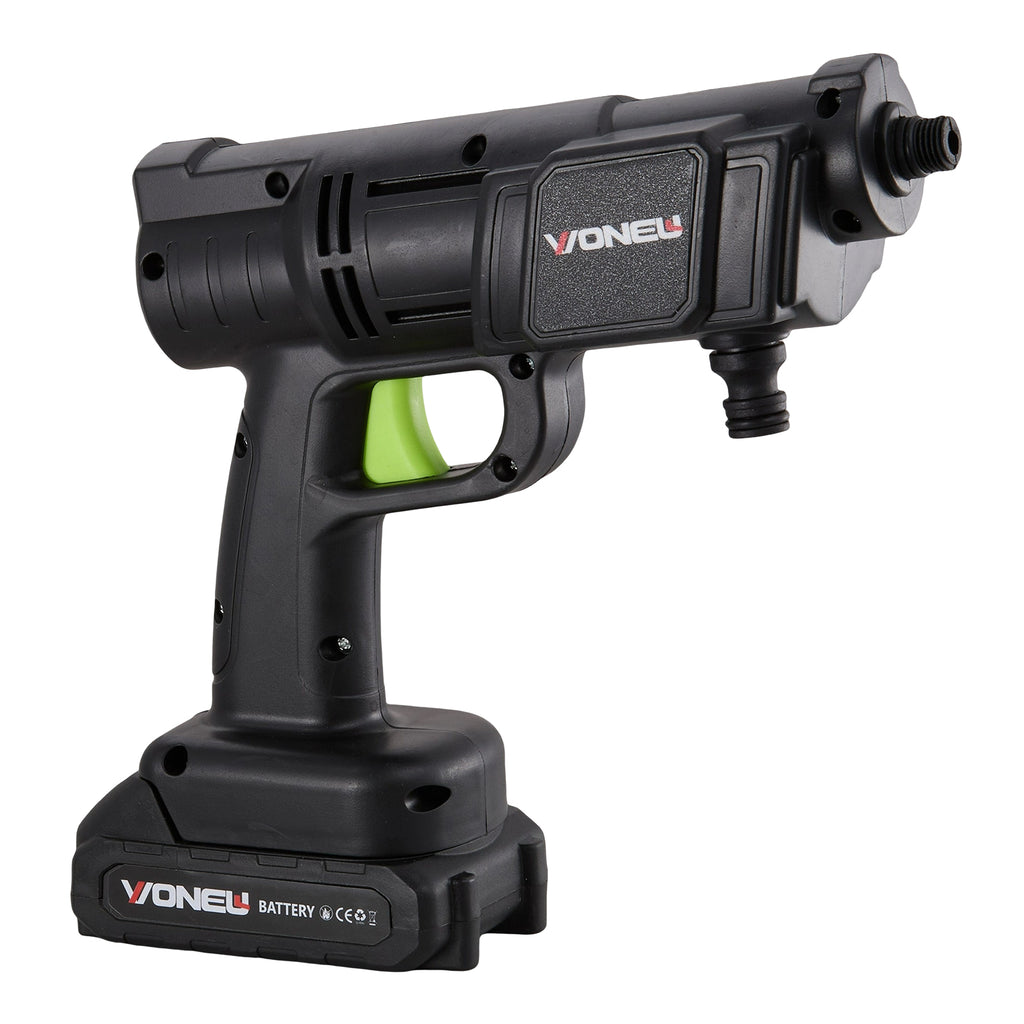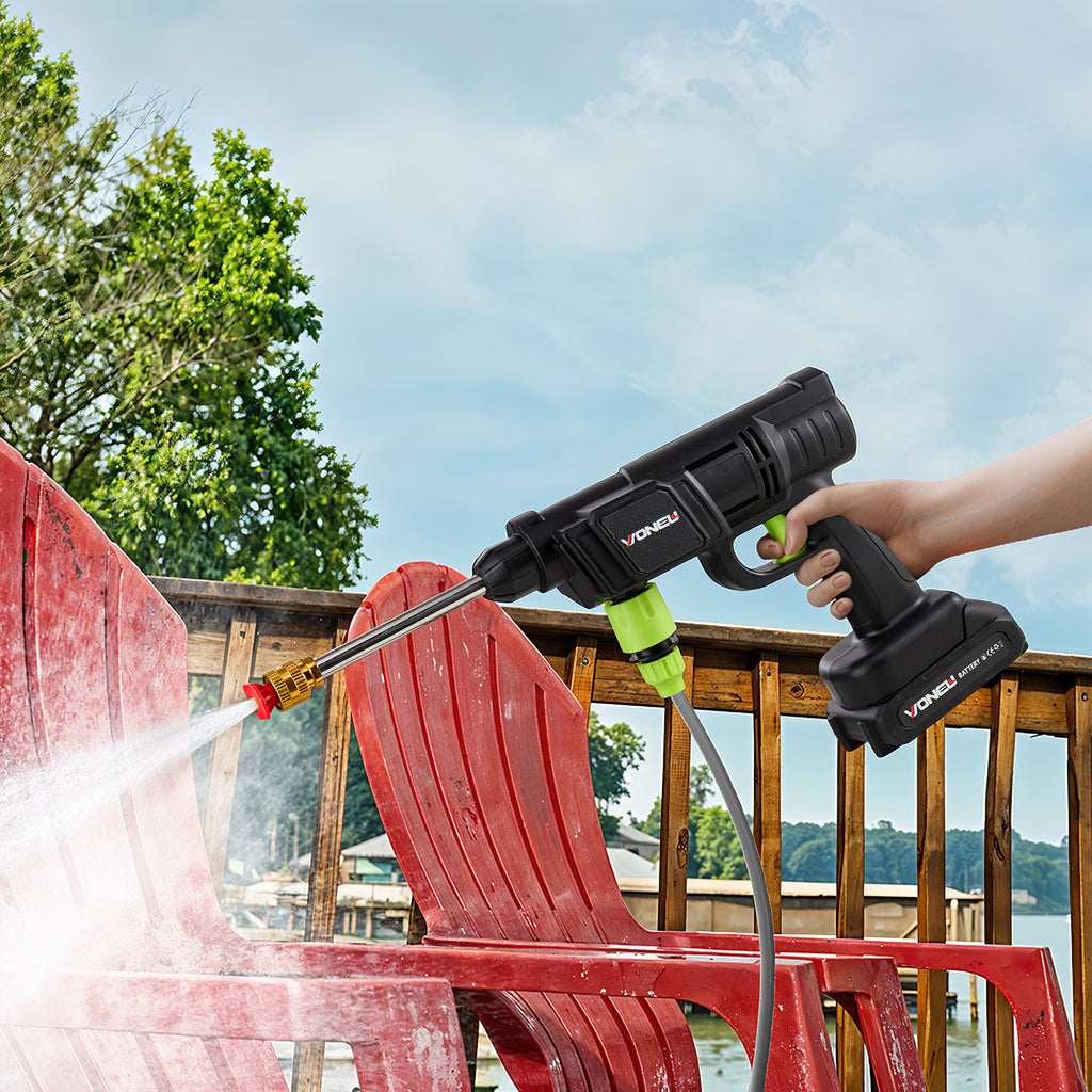 Tackle all your outdoor tasks with this cordless handheld pressure washer. Ideal for watering plants, washing cars or cleaning patios, it features a powerful motor and rust-resistant extension rod. The 5m hose with filter keeps out debris for smoother use. Two spray nozzles offer adjustable pressure. The wireless design and long-lasting battery ensure complete freedom of movement.