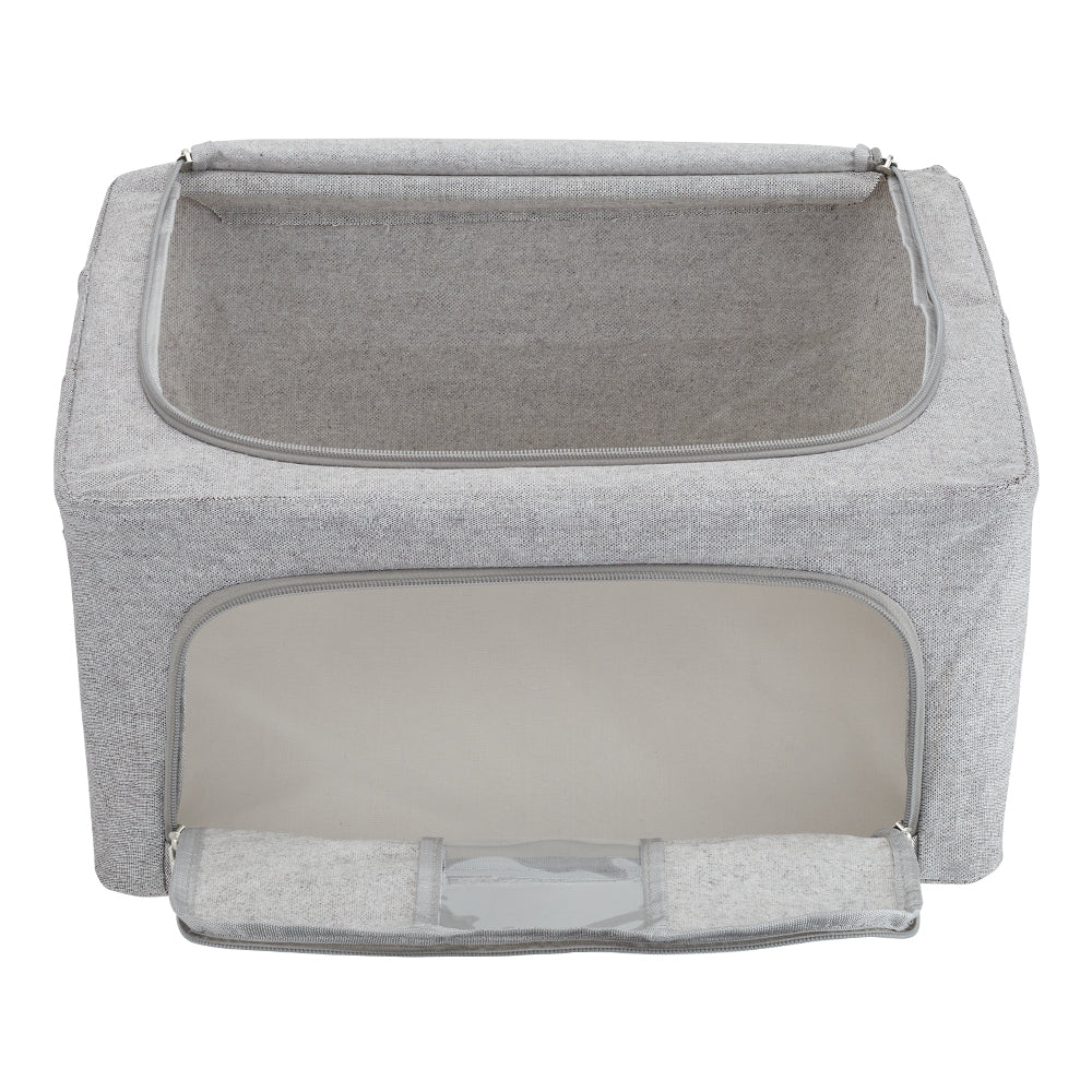 The Fabric Storage Container with Clear Window offers a practical and stylish solution for keeping clothes and essentials neatly organised. Designed with a sturdy inner metal frame, it maintains its shape even when fully loaded. The large transparent window on the front and side allows quick identification of stored items, saving time and effort. Crafted from odourless, breathable fabric, it ensures your garments stay fresh and clean. When not in use, it conveniently folds flat to save space.
