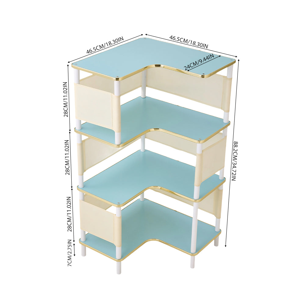 The 4-Tier L-Shaped Corner Bookshelf combines minimalist elegance with practical storage for any room. Its L-shaped design fits neatly into corners, offering four tiers of open storage for books, decor, or plants. Gold-plated frames and thickened boards ensure durability and strong load-bearing capacity. Rounded edges provide safety, and side fabric baffles prevent items from falling. Perfect for organising and displaying belongings, it keeps spaces tidy and visually appealing.