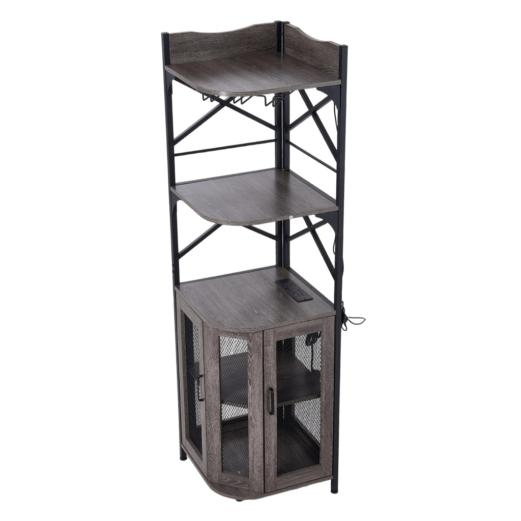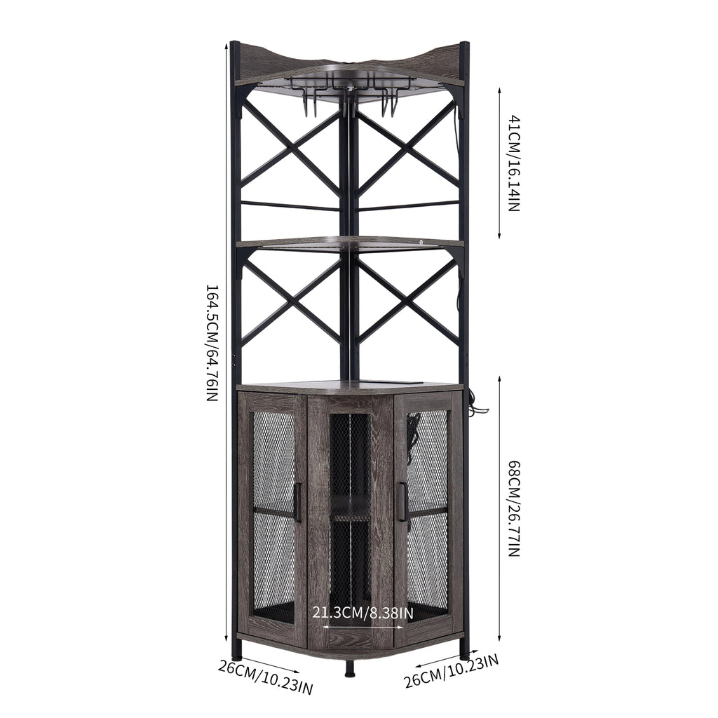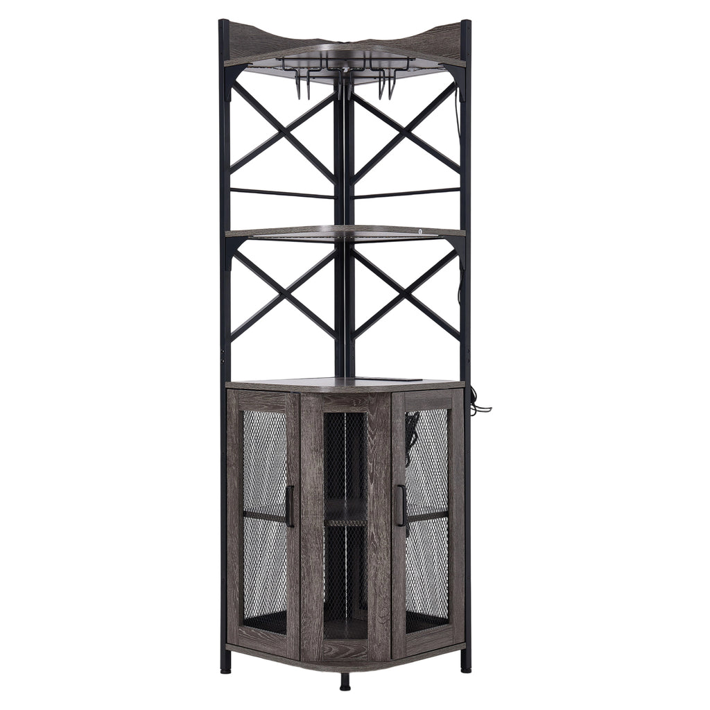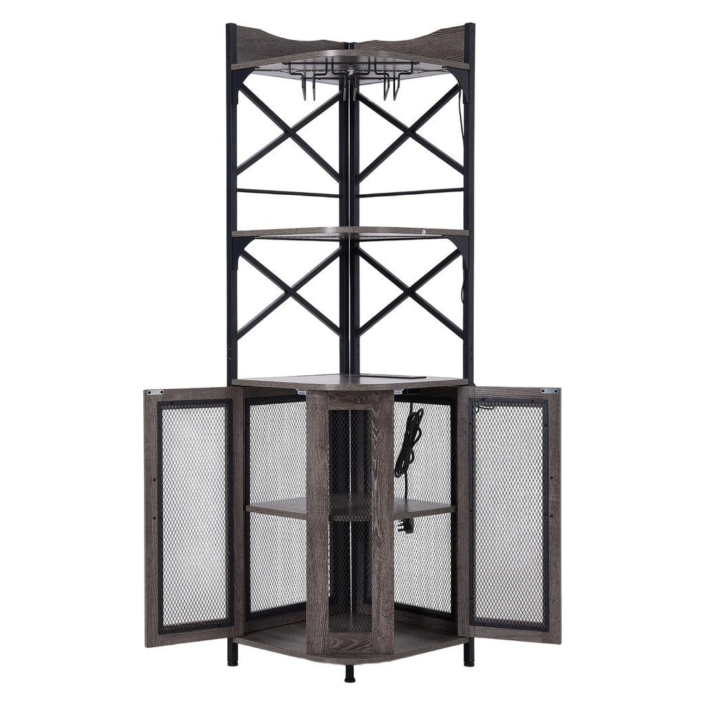 Enhance your home bar with this Industrial-Style Corner Bar Cabinet. Featuring wine shelves, hanging glass holders, a storage cabinet, RGB LED lights with music sync, and a built-in charging station, it combines style, functionality and modern technology for the ultimate entertaining experience.