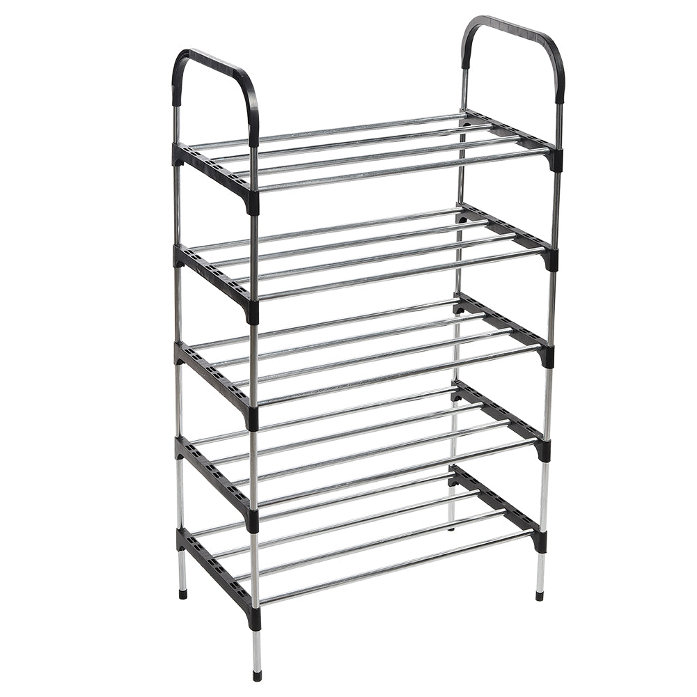 A tiered floor-standing shoe rack is a practical solution for any household, helping to keep spaces neat and organised. With its minimalist design, the lightweight yet sturdy tubular metal frame is easy to move while ensuring long-lasting durability. The slatted shelves promote airflow to keep shoes dry and free from odour. Quick to assemble, the rack requires no extra tools.