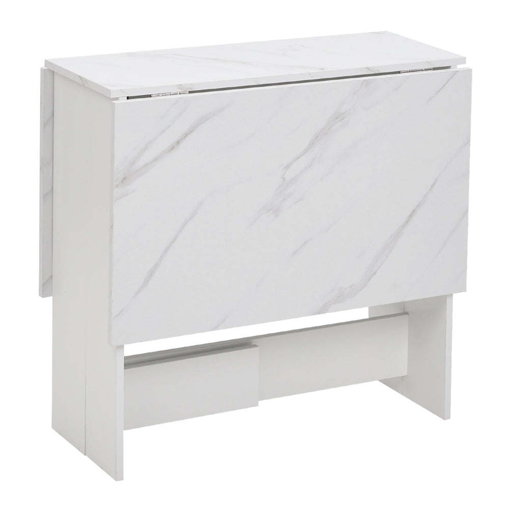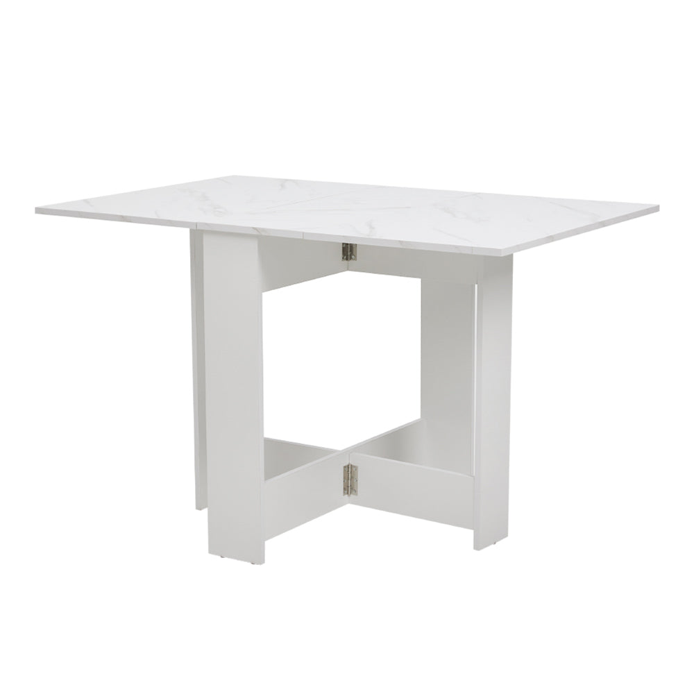 This modern drop leaf dining table is a practical choice for homes needing both flexibility and style. With two foldable sides, it easily adapts to seat up to six people or folds down compactly when not in use. The melamine-coated surface provides a smooth, liquid-resistant finish, while the sturdy particleboard construction guarantees durability. Ideal for use as a dining table, side table, or even a workspace in small spaces.
