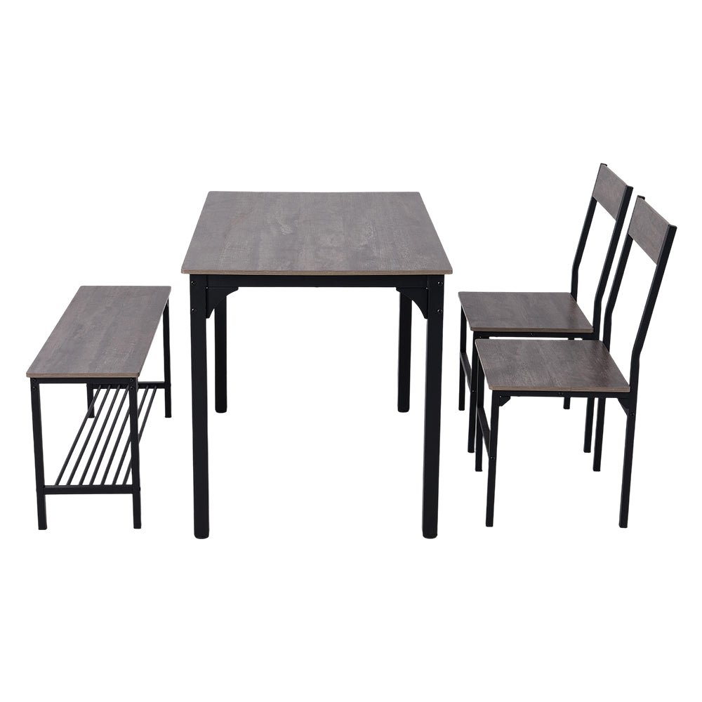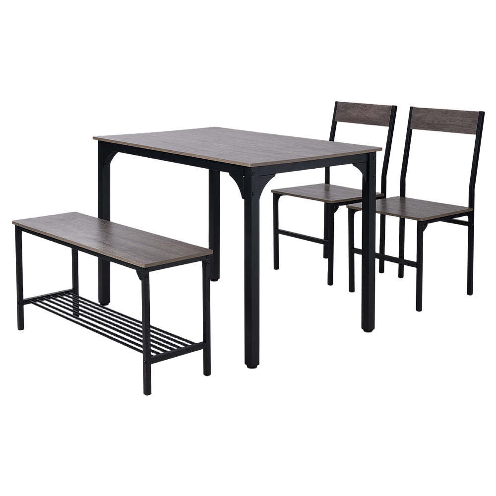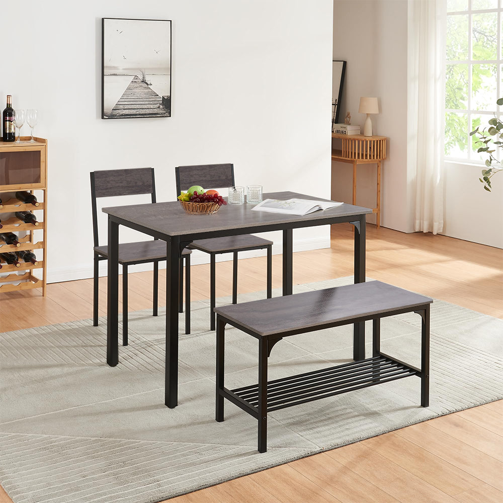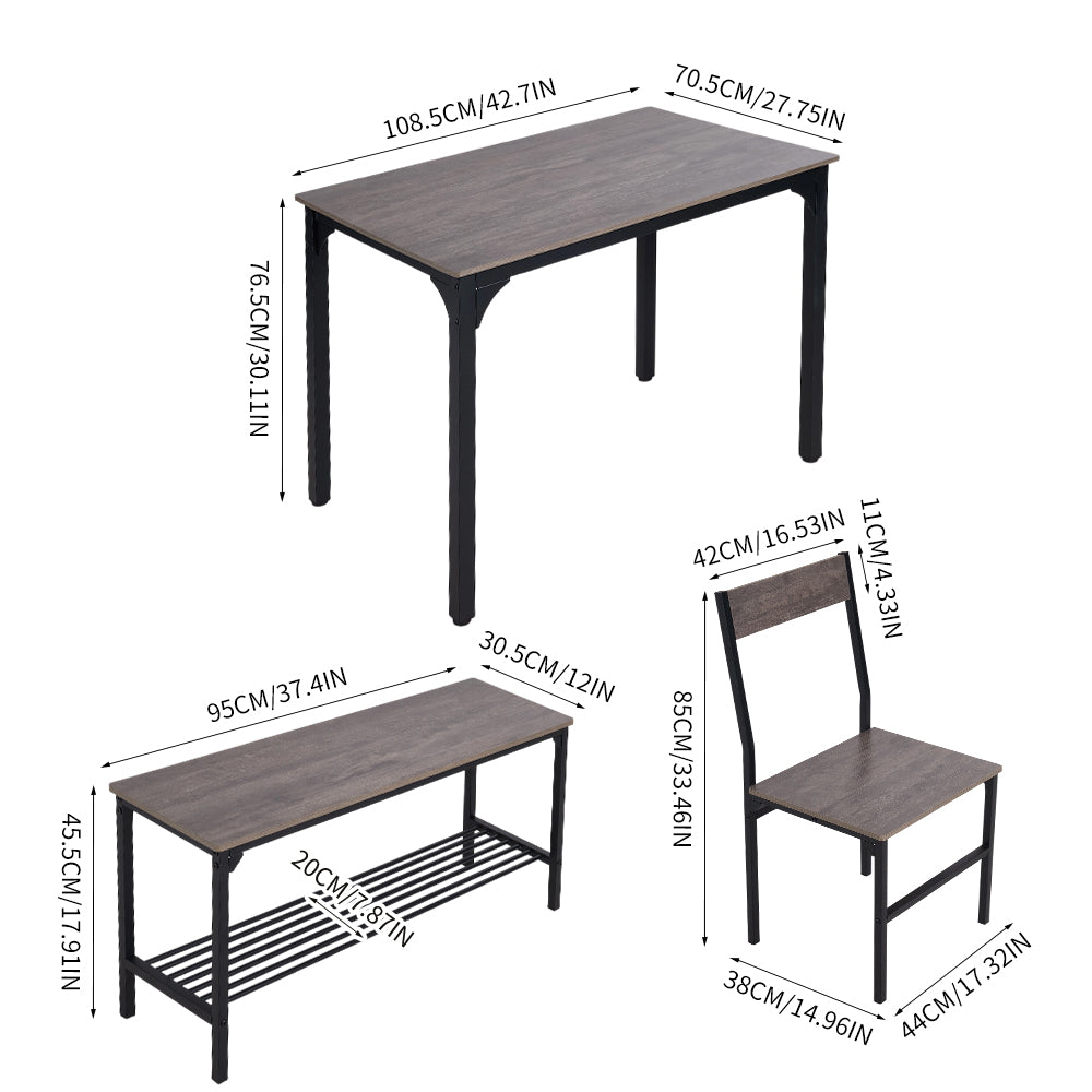Enhance your dining area with this Modern 4-Piece Dining Table Set. The set includes a spacious table, two ergonomic high-back chairs, and a versatile 2-person bench with built-in storage, combining style, comfort, and practicality for meals, study, or work.