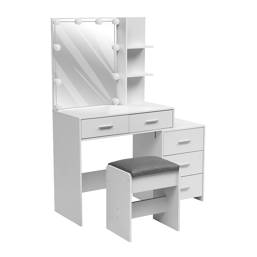 This dressing table set features a large Hollywood-style mirror atop a spacious tabletop, creating a personal beauty sanctuary in your bedroom. The generously sized mirror is framed with 10 exposed bulbs, providing ample lighting for a professional makeup experience. Five drawers offer convenient storage for cosmetics and skincare, keeping your items organised while the tabletop remains neat and clutter-free.