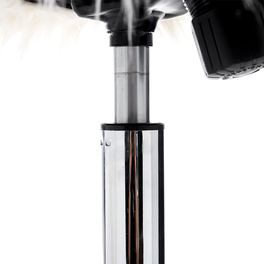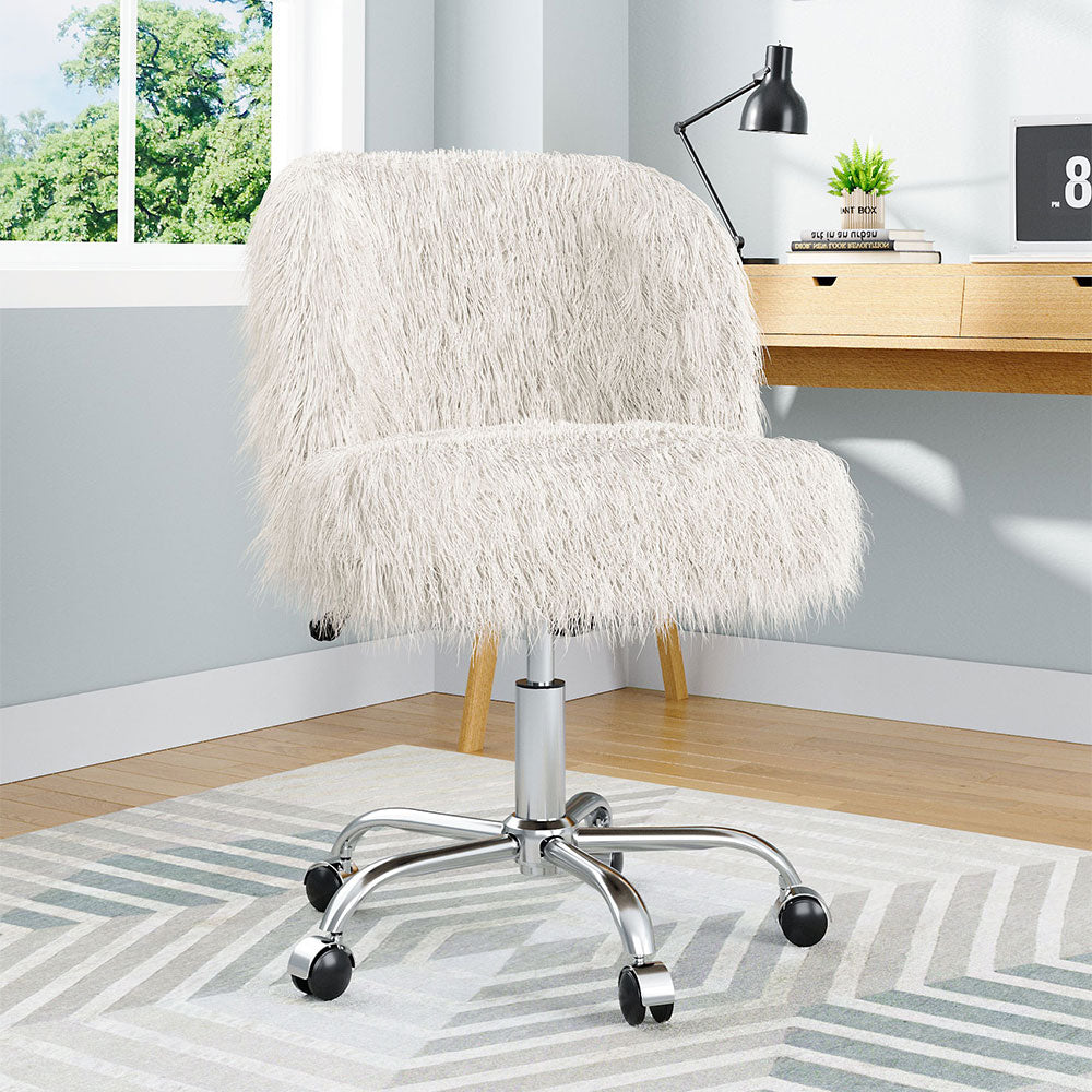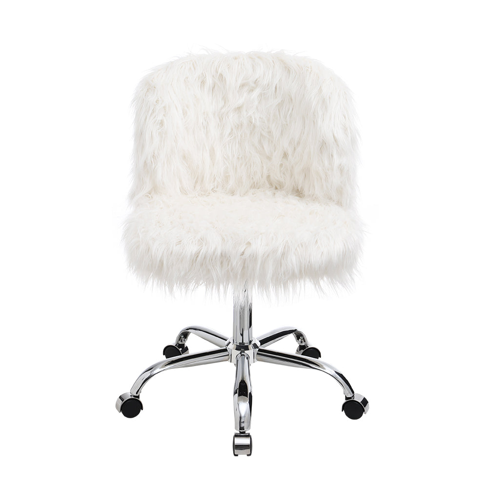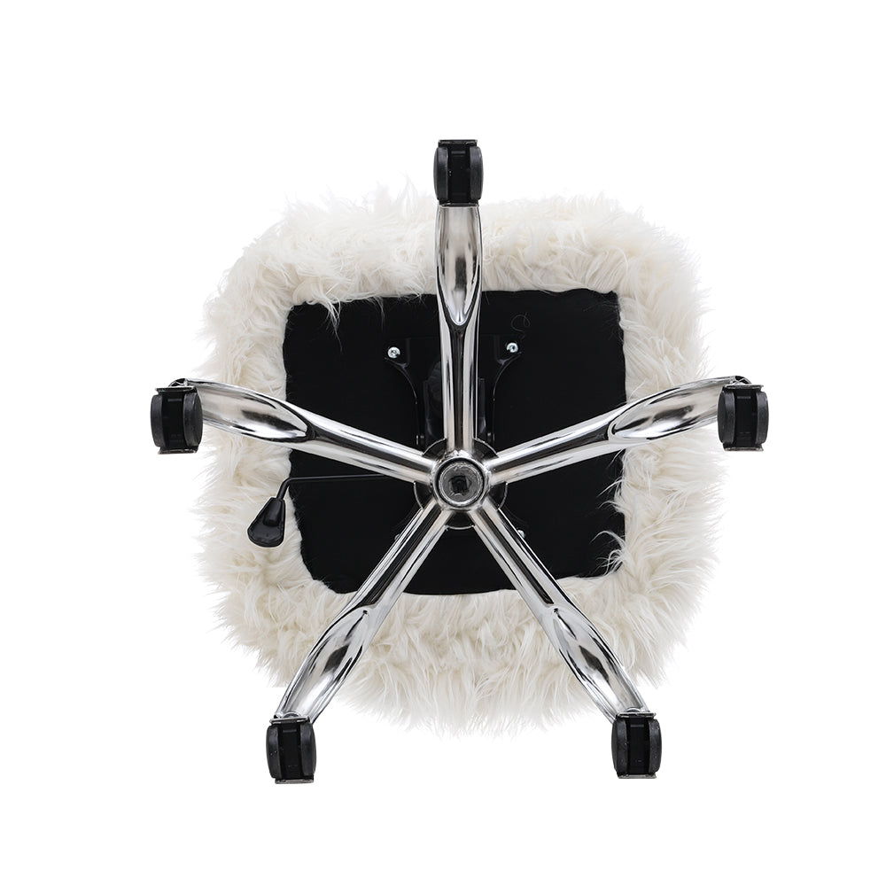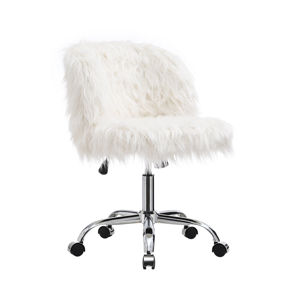 Stylish and fuzzy to the touch, this versatile and fashionable white fur desk chair takes the boring out of typical home or professional office seating. Crafted on metal frame, silver finish that complements any color scheme in your space. High-density foam fill provides extra padding, provides you with a comfy seating experience, one-touch height adjustment lever to suit your needs. Brush it to fluff up the faux fur when taking out the faux fur chair. Maintenance is also very easy, just wipe the pink furry chair with a slightly moistened cloth, and then choose a site that's well ventilated for air drying without direct heat or sun. Flat packing, tools and instructions are included. The plush vanity chair can be put on the living room or bedroom, as home office chair, makeup stool or children remote learning chair.
