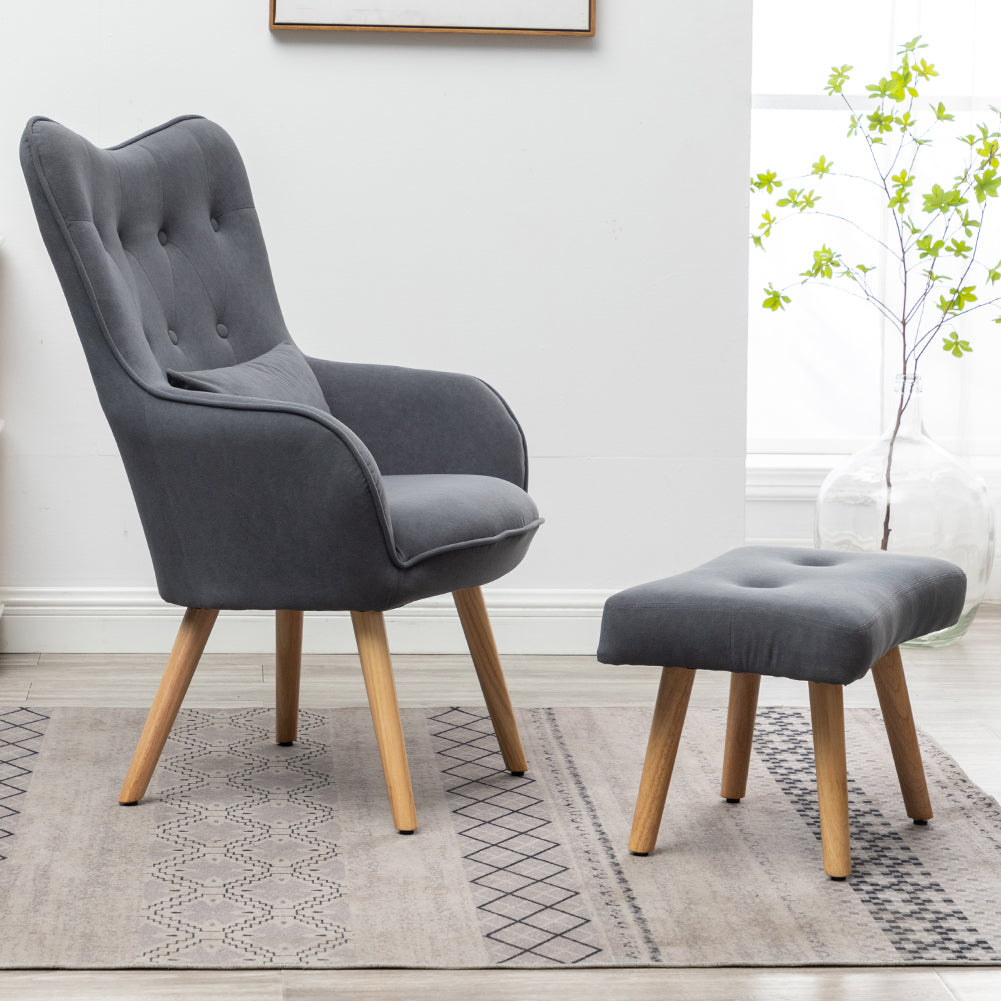 Add elegance and comfort to your living space with this Upholstered Armchair and Footstool Set. Featuring a soft frosted velvet finish, button-tufted backrest, and a matching cushion, it combines sophistication with relaxation. Supported by sturdy wooden legs, this chair offers both style and stability.