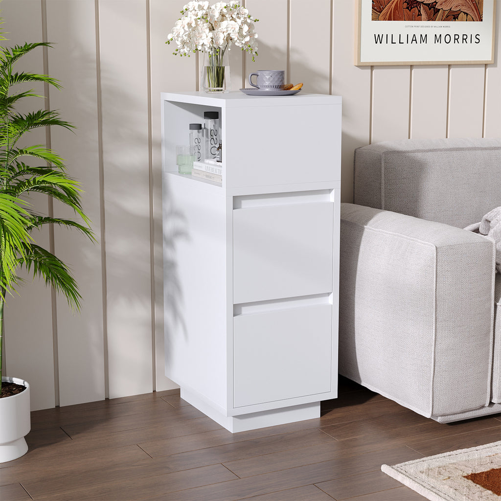 Combine minimalist style with practical storage with this Bedside Table. Featuring a clean design, a flat top, an open shelf, and two drawers, it keeps essentials organised while complementing any décor.