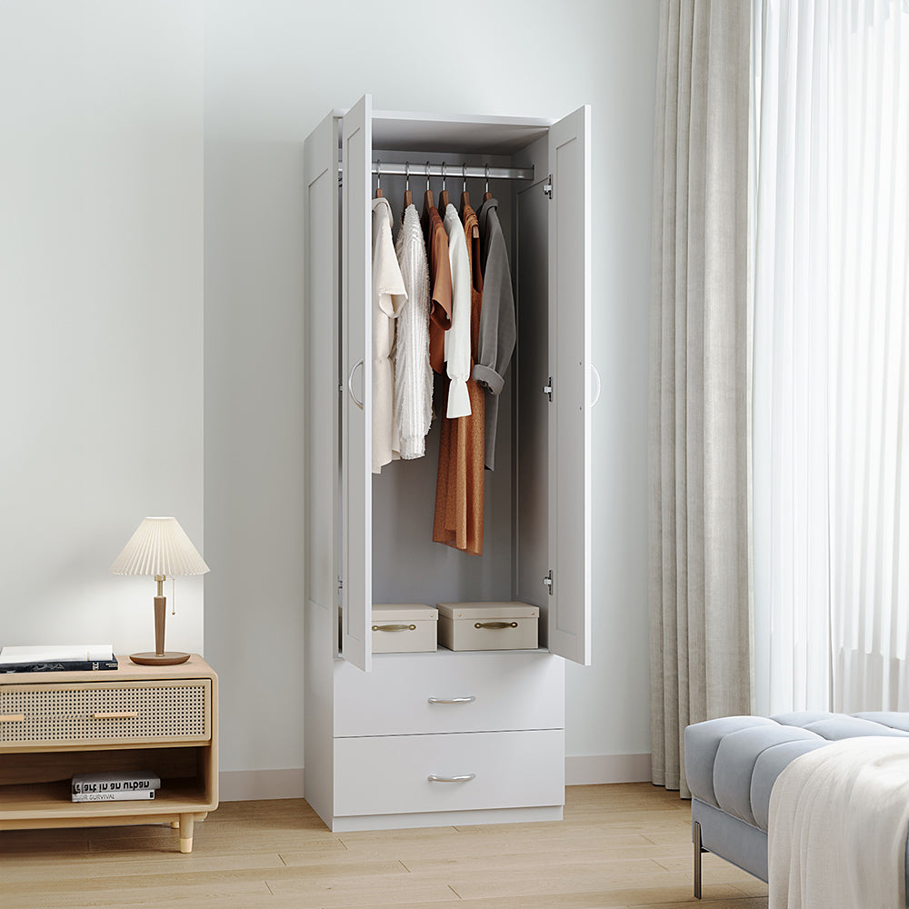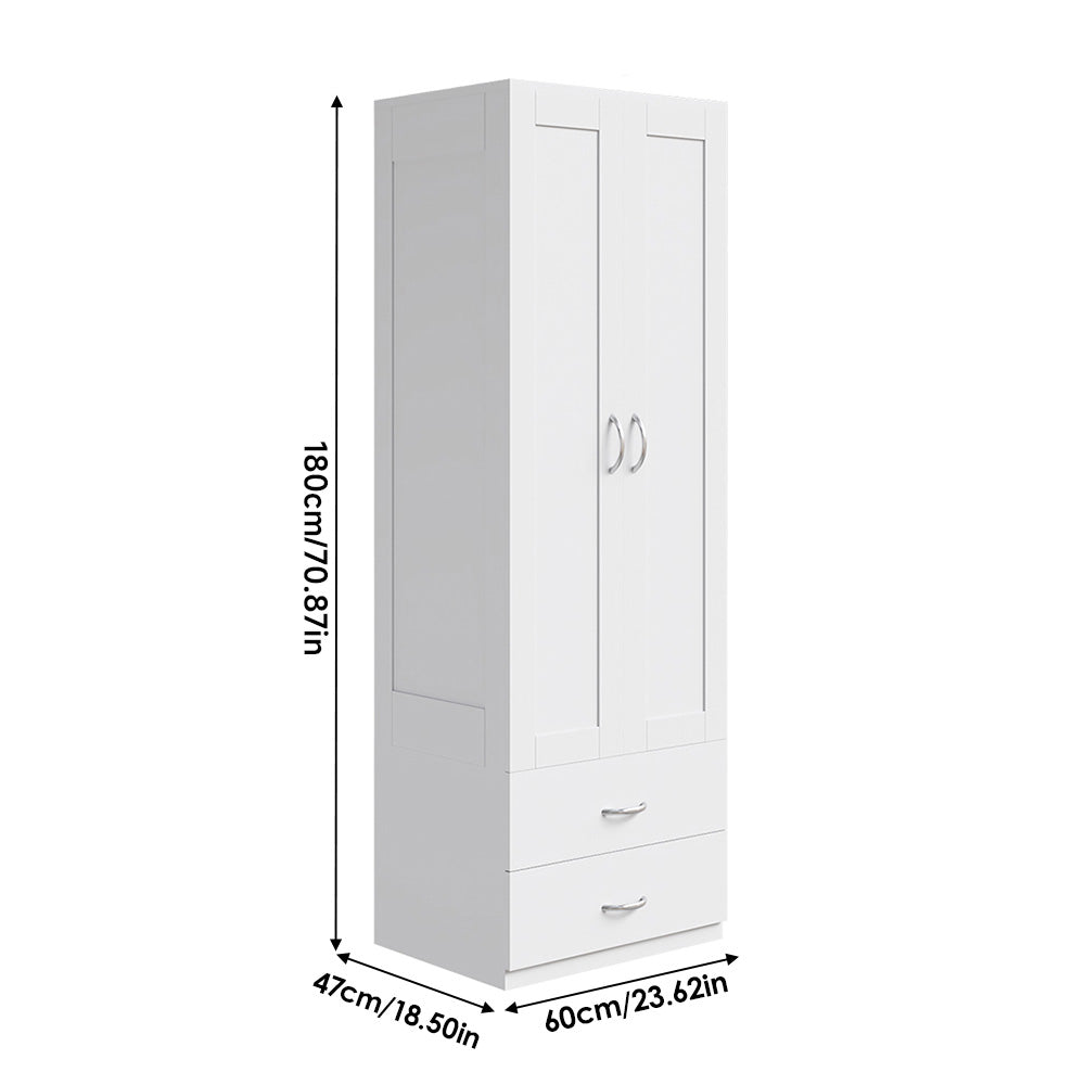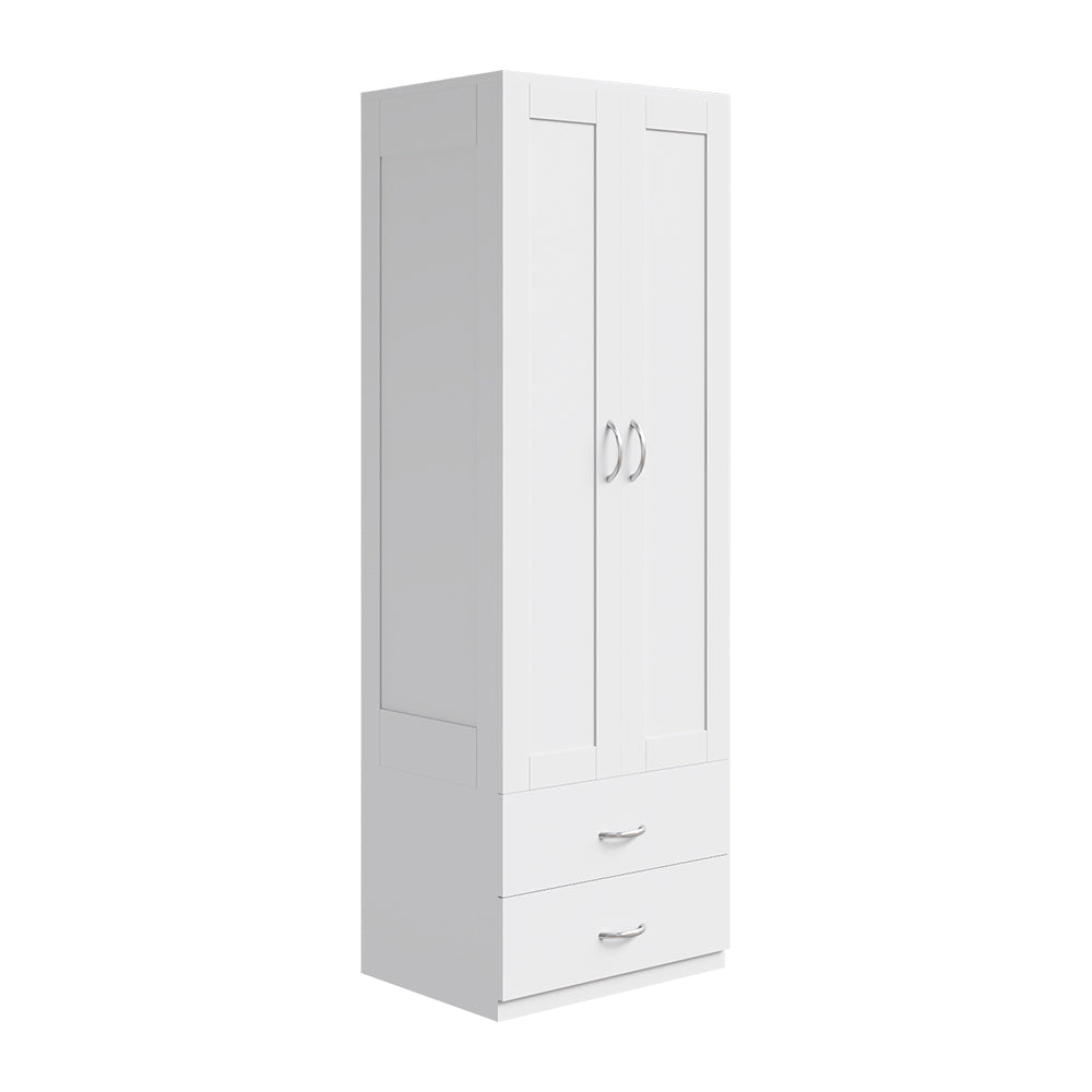 The Modern 2-Door Wardrobe with 2 Drawers combines sleek design with practical storage for any bedroom. Its hanging rod and spacious lower compartment keep clothes and bulky items organised, while two drawers provide convenient storage for smaller essentials. Crafted from durable engineered wood, it ensures long-lasting use with a refined look. Compact yet functional, it maximises storage without overwhelming your space. Perfect for bedrooms or guest rooms, it blends elegance with everyday practicality.