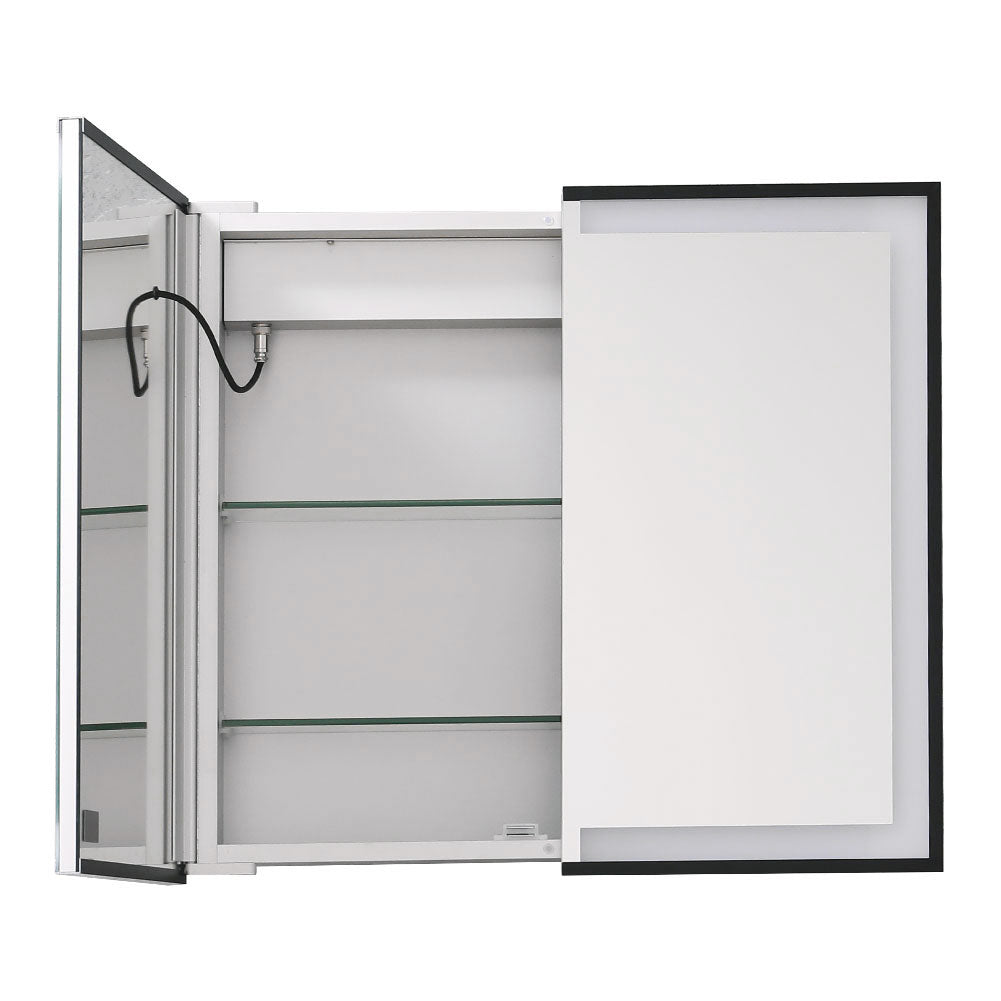 Enhance your bathroom with this modern black LED mirror cabinet featuring double-sided doors. The squared LED bar provides 360-degree illumination for an optimal skincare experience. Made from durable aluminum with tempered glass shelves, it offers both strength and style. The double-sided mirror allows convenient viewing from any angle, while the built-in shaver socket keeps your essentials powered and accessible. Its minimalist design fits seamlessly into any bathroom decor.