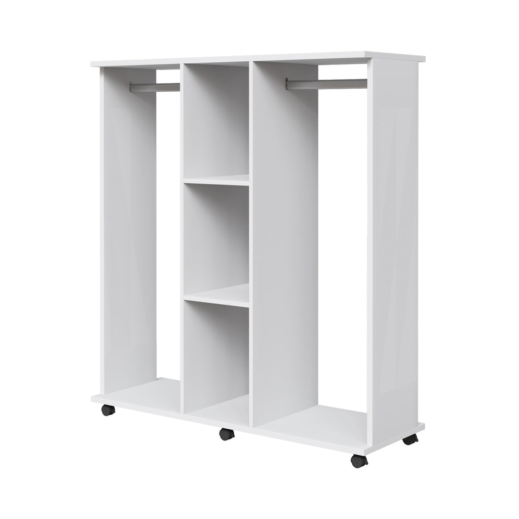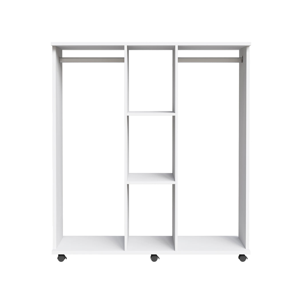 The Freestanding Open Wardrobe with Shelves offers a practical and stylish solution to bedroom organisation. Its three zone design features two hanging rails and central shelves, keeping clothes, shoes, and accessories neatly stored. Smooth swivel casters provide effortless mobility, while durable engineered wood ensures lasting stability. The open structure promotes airflow to maintain fresh garments, and the flat top adds extra storage space. Ideal for bedrooms or compact spaces, it maximises storage while maintaining a modern aesthetic.