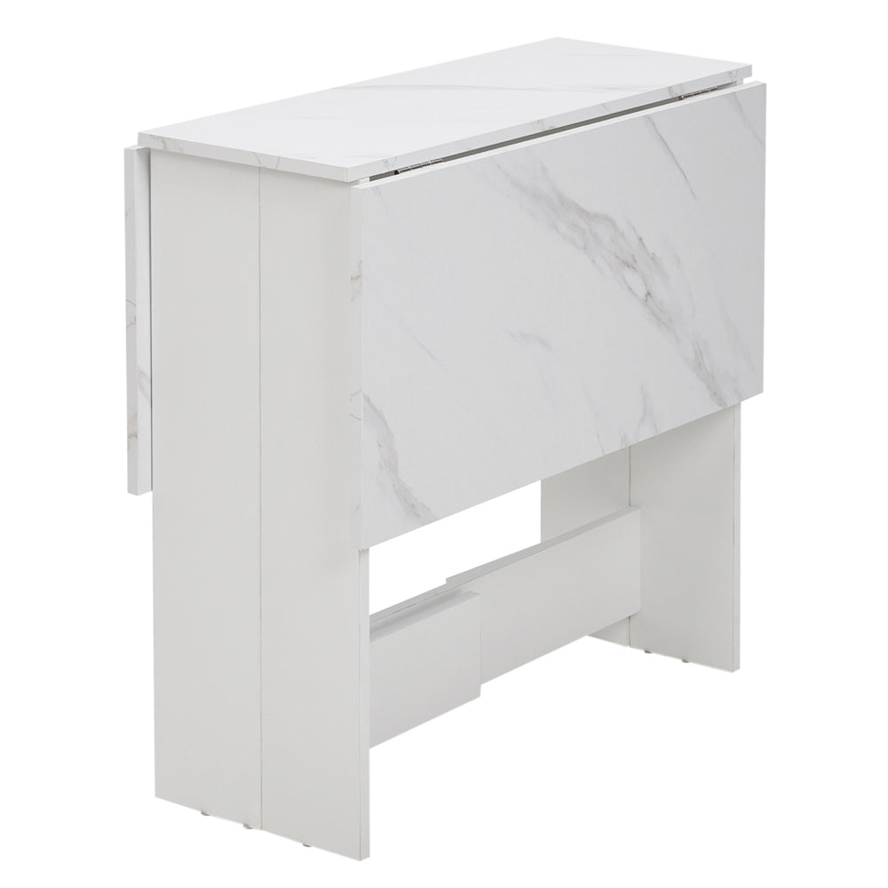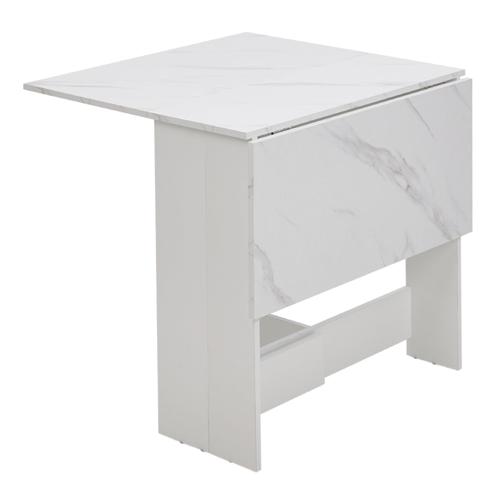 This modern drop leaf dining table is designed to maximize space while offering flexibility for everyday use. With two foldable leaves, it expands to comfortably seat up to six people and folds down compactly when not in use. The melamine-coated surface is smooth and resistant to liquids, while the sturdy particleboard construction ensures stability and durability. Perfect as a dining table, side table, or even a workspace in small living spaces.
