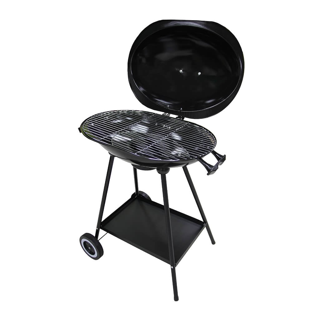 Oval Kettle BBQ is Ideal for small patios or gardens. It features a round cooking area, storage tray, hooded lid and an ash catcher which makes cleaning easy. There are 2 wheels which make it easy and store away.