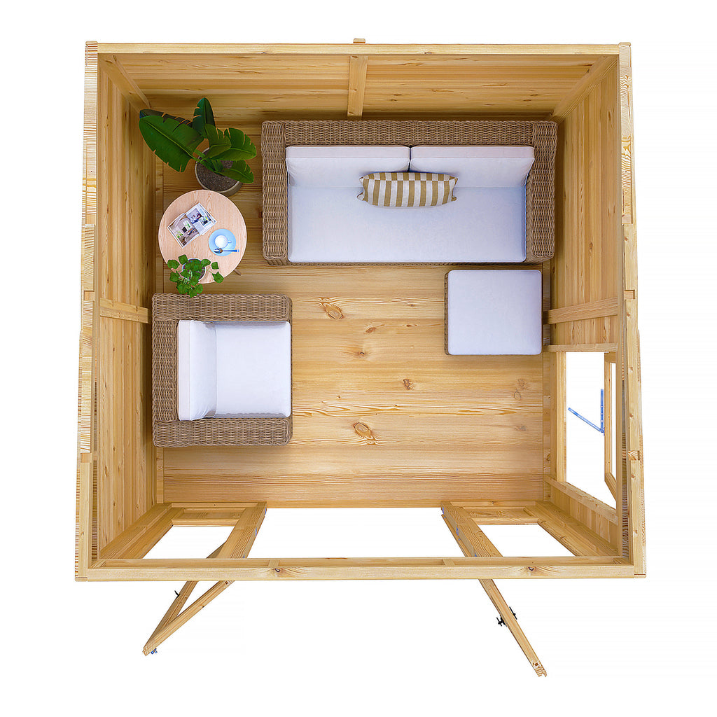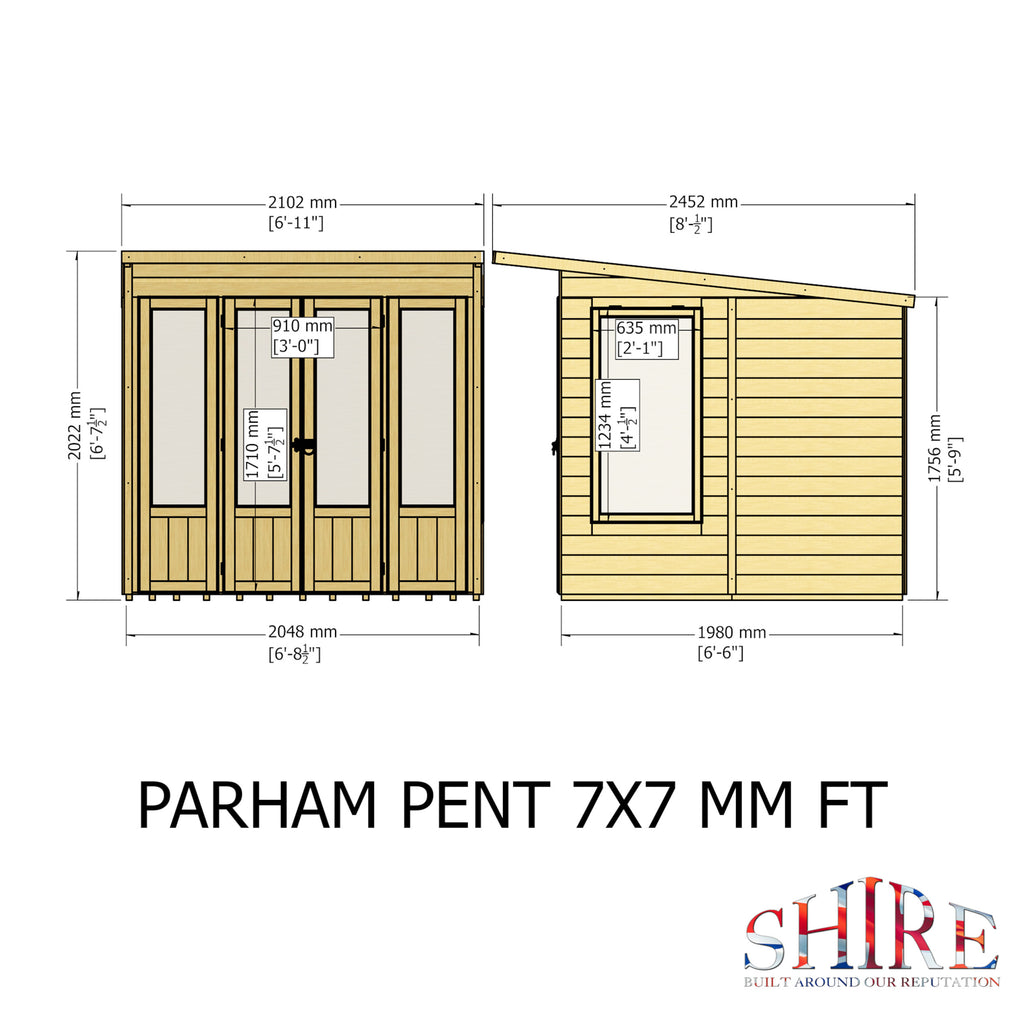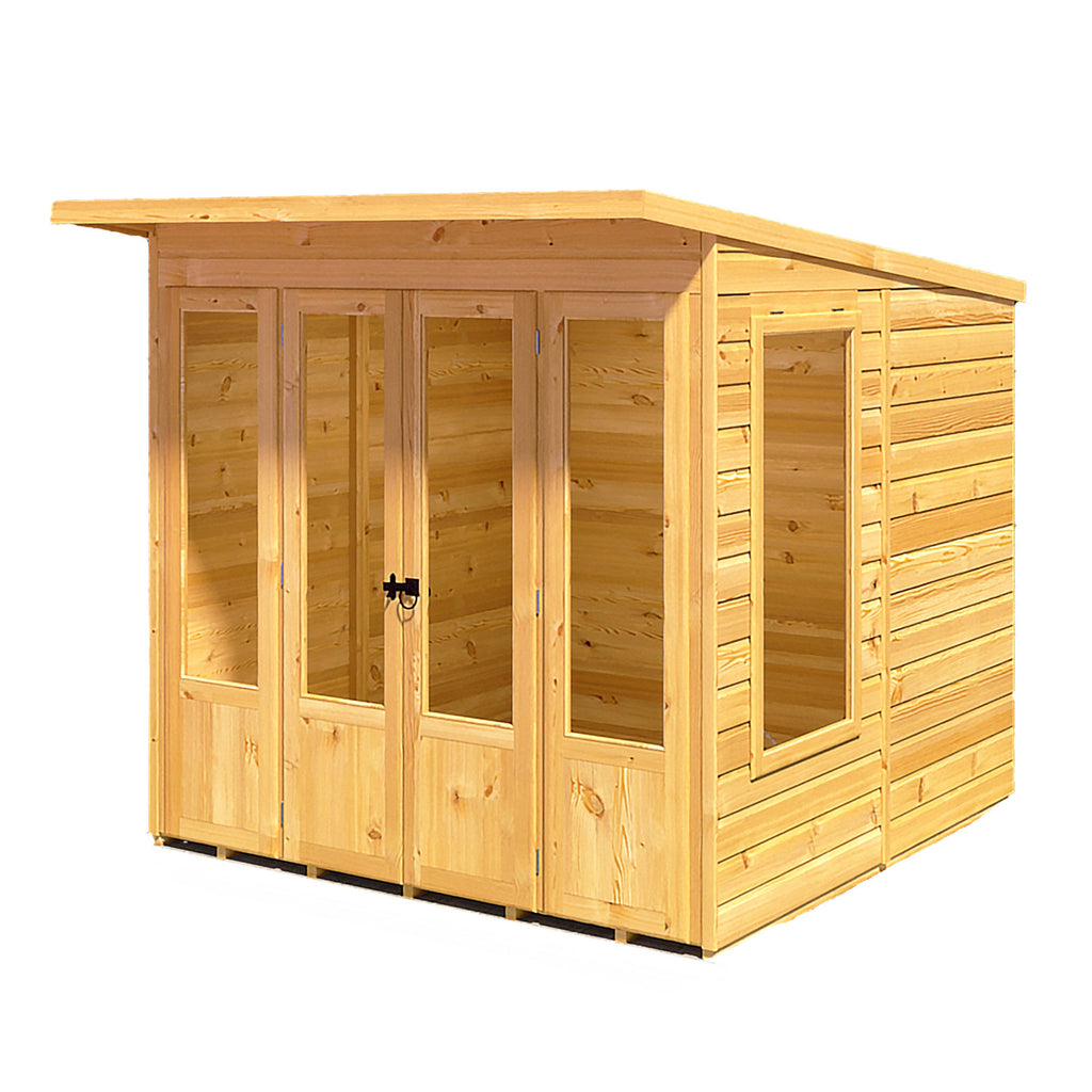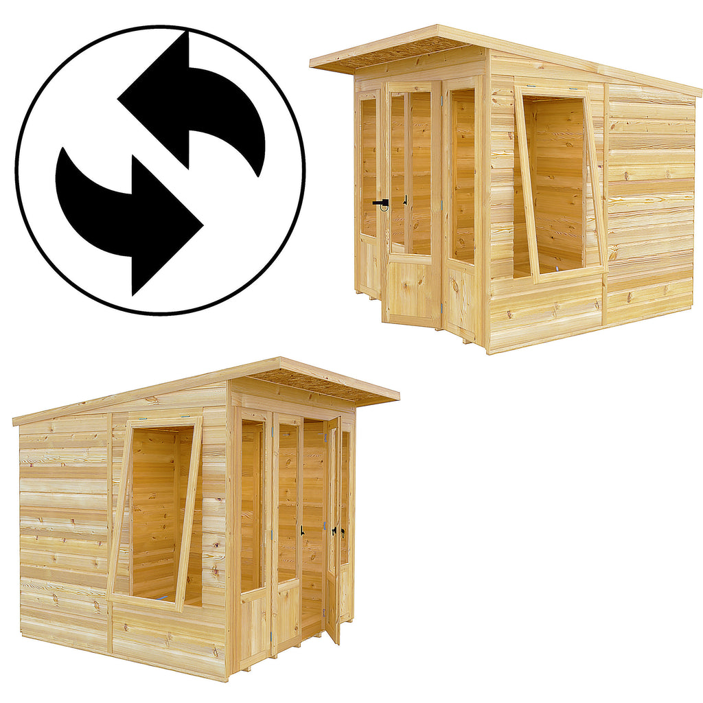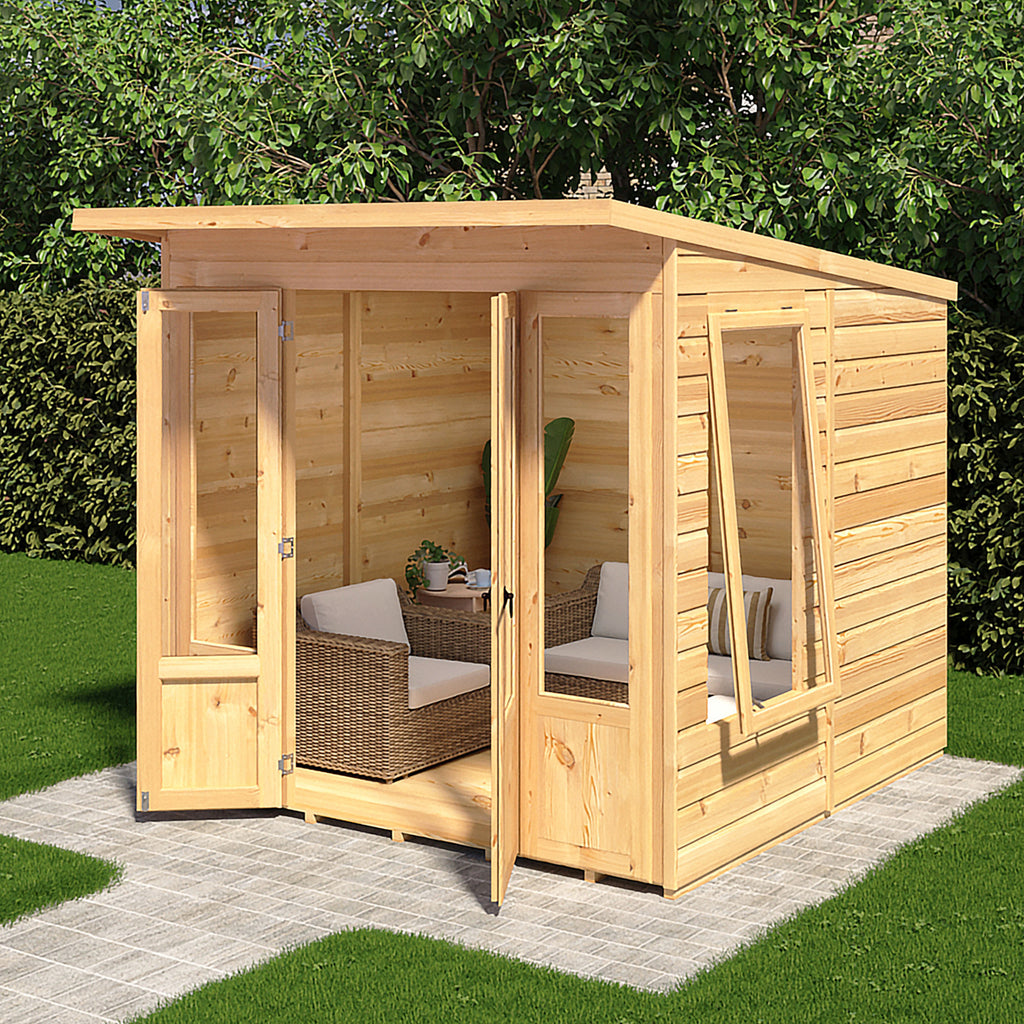 A modern summerhouse that is both attractive and practucal, the Parham Pent has double doors which open out to the front and a large opening side window which can go on either side. The three opening windows and doors are glazed in acrylic for your safety. It is constructed on 34mm square framing and clad with planed Shiplap tongue and groove boards made only from the highest grade, slow grown, FSC approved, northern European pine with T&G roof and floor. Dipped base coat preservative ready for you to top coat.