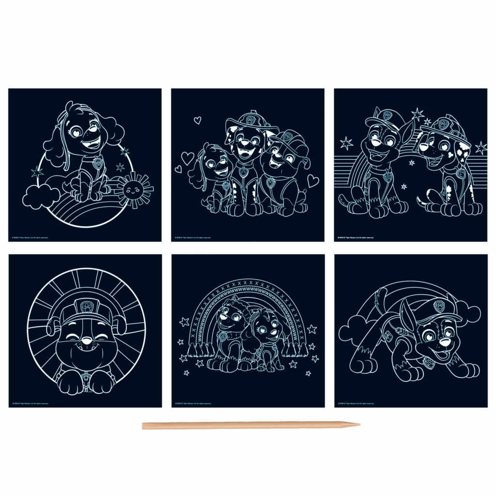 Includes 6 scratch cards featuring Paw Patrol characters and scenes.