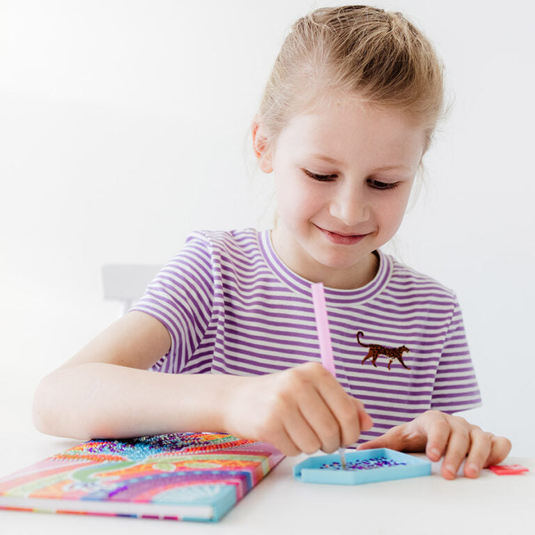 The process is simple and mess-free. The journal cover is pre-printed with the design and has a self-adhesive surface. Just use the special applicator tool and wax to pick up the tiny gems and place them onto the corresponding colour and letter on the cover. The finished journal is a unique and dazzling piece of stationery, perfect for writing, drawing, or giving as a handmade gift.
