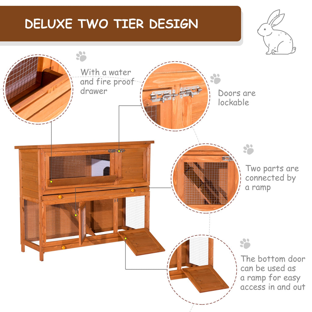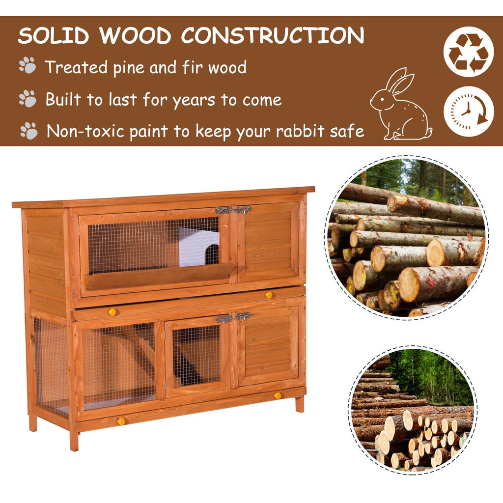 - Made from anti-fungal treated pine and fir wood, it creates a strong long-lasting home for your rabbits. Finished with non-toxic paint for weather protection. It has a sheltered sleep compartment on top with an equal sized under run below, which has 2 wire sides & a wooden back. Double Tier. Slideout Tray for Easy Cleaning & Large Opening Locking Run Door. Dimensions: 120L x 48W x 100Hcm.