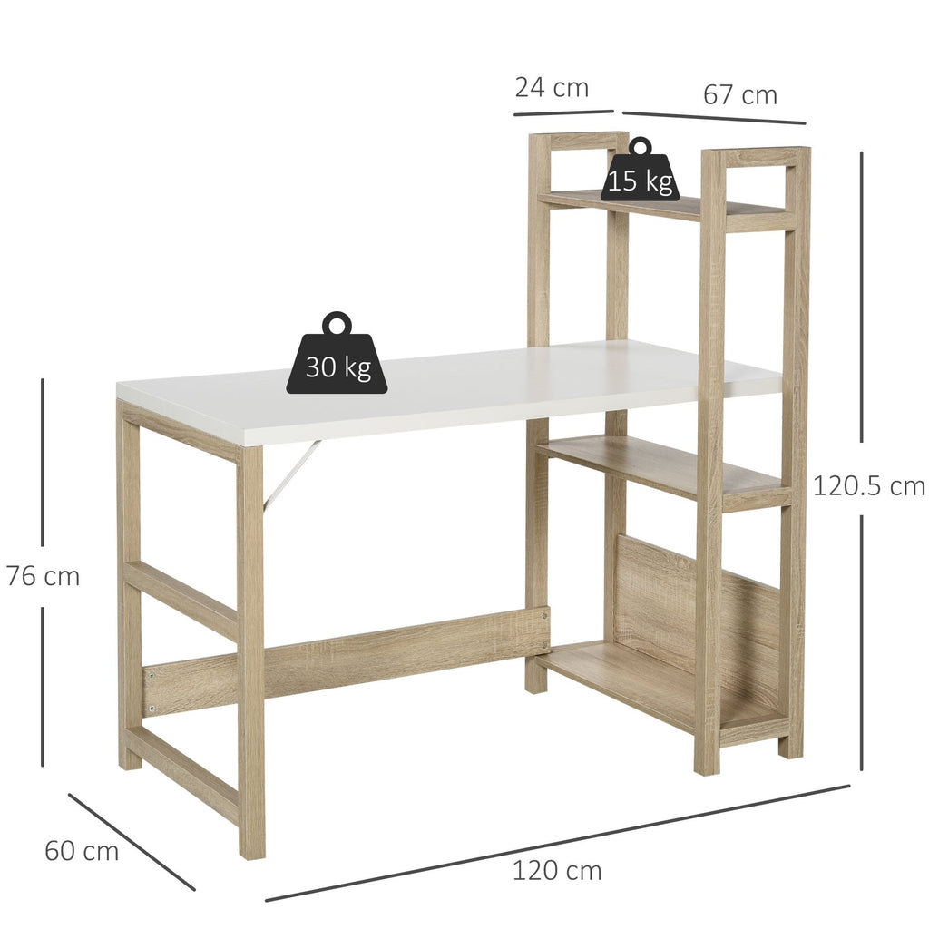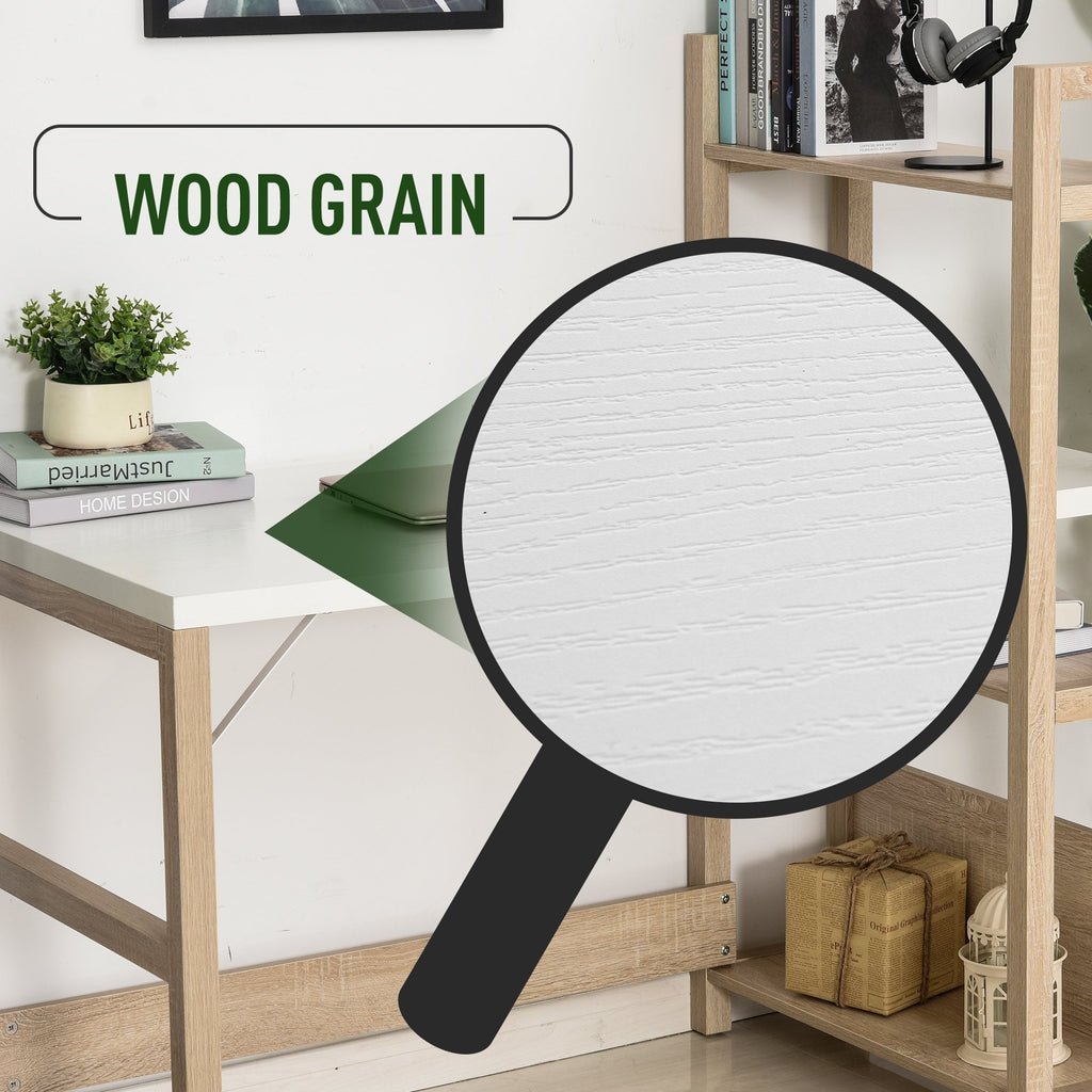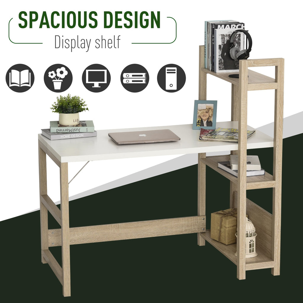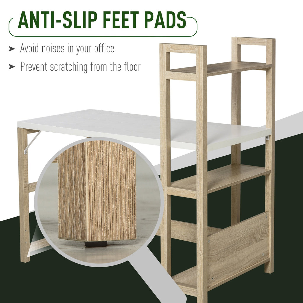 Let this desk from HOMCOM take the hard work off your schedule this season. It's a duo design which gives you space to work and keep everything organised together in one stylish spot: fusing a work desk with side shelves. Built from particle board, the solid construction secures a reliable place to work on, with a smooth melamine coating to protect against light marks and damage. Fitted on the right side, the three spacious shelves give you lots of holding and display room for everything you need close by - whether it be folders, books and other office essentials. It's finished with anti-slip feet for floor protection and reinforced accents on the frame for extra strength.