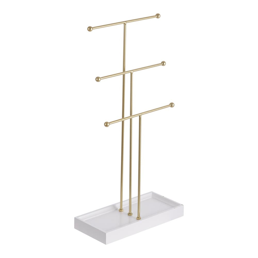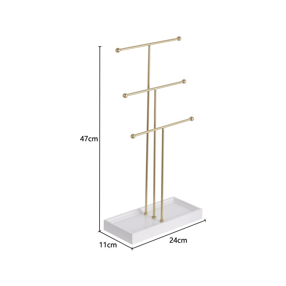 This stylish jewelry stand is perfect for organising your accessories with ease. Say goodbye to rummaging through basketsâ??necklaces, bracelets, watches, and rings are all kept neatly in place and easily accessible. Designed to be both practical and visually appealing, it stands securely on any tabletop without tipping, even when holding longer necklaces or a larger collection. The wooden tray at the base provides extra space for rings and earrings, adding an elegant and luxurious touch to your dressing table or vanity.