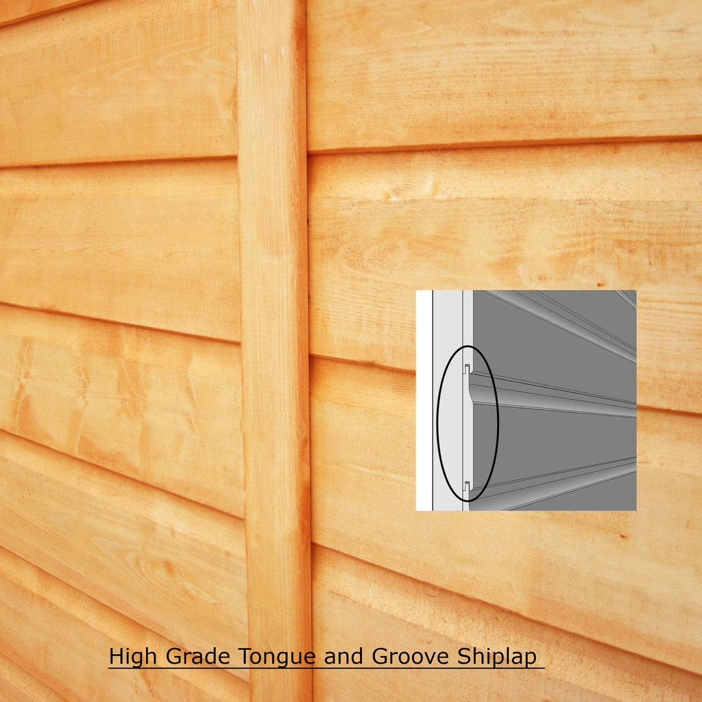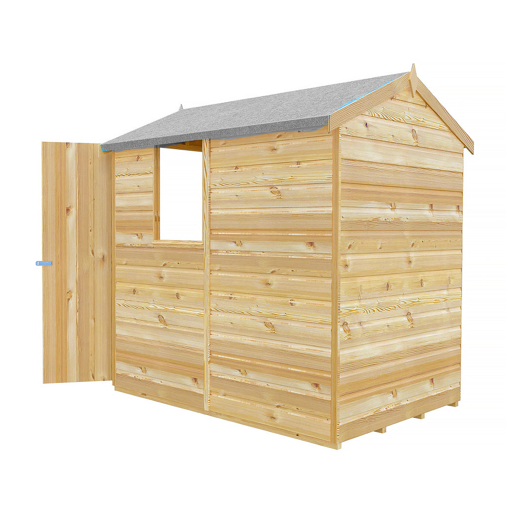 A popular garden shed which is manufactured from high grade, FSC approved timber with 12mm shiplap tongue and groove cladding over sturdy 34mm square framing with OSB roof and floor. With one fixed, glass window that can go either side and a single door. Door comes with hasp & staple ready for your own padlock. Dipped base coat preservative ready for you to top coat.