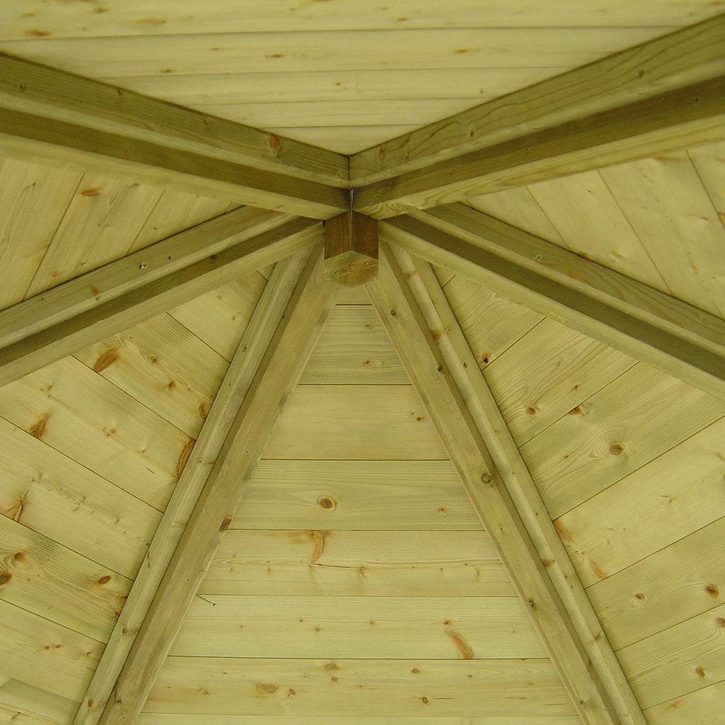 Extremely attractive hexagonal design reminicent of a pagoda style, the Shire Arbour makes a perfect place to sit or dine. It is manufactured from high grade, slow grown, FSC approved, northern European pine which has been pressure treated to protect it from rot and insect attack for many years. Supplied in its natural pressure treated finish although the arbour can still be painted or stained to suit your garden. The roof and walls are 12 mm shiplap with a 19 mm timber floor; all framing is 34 mm square.