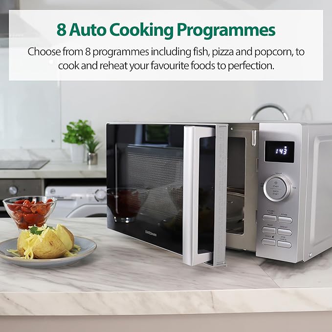 - EFFORTLESS COOKING: It comes equipped with 8 auto cooking programmes that simplify meal preparation. Just choose the desired program, and the microwave will automatically adjust cooking time and power for optimal results.
