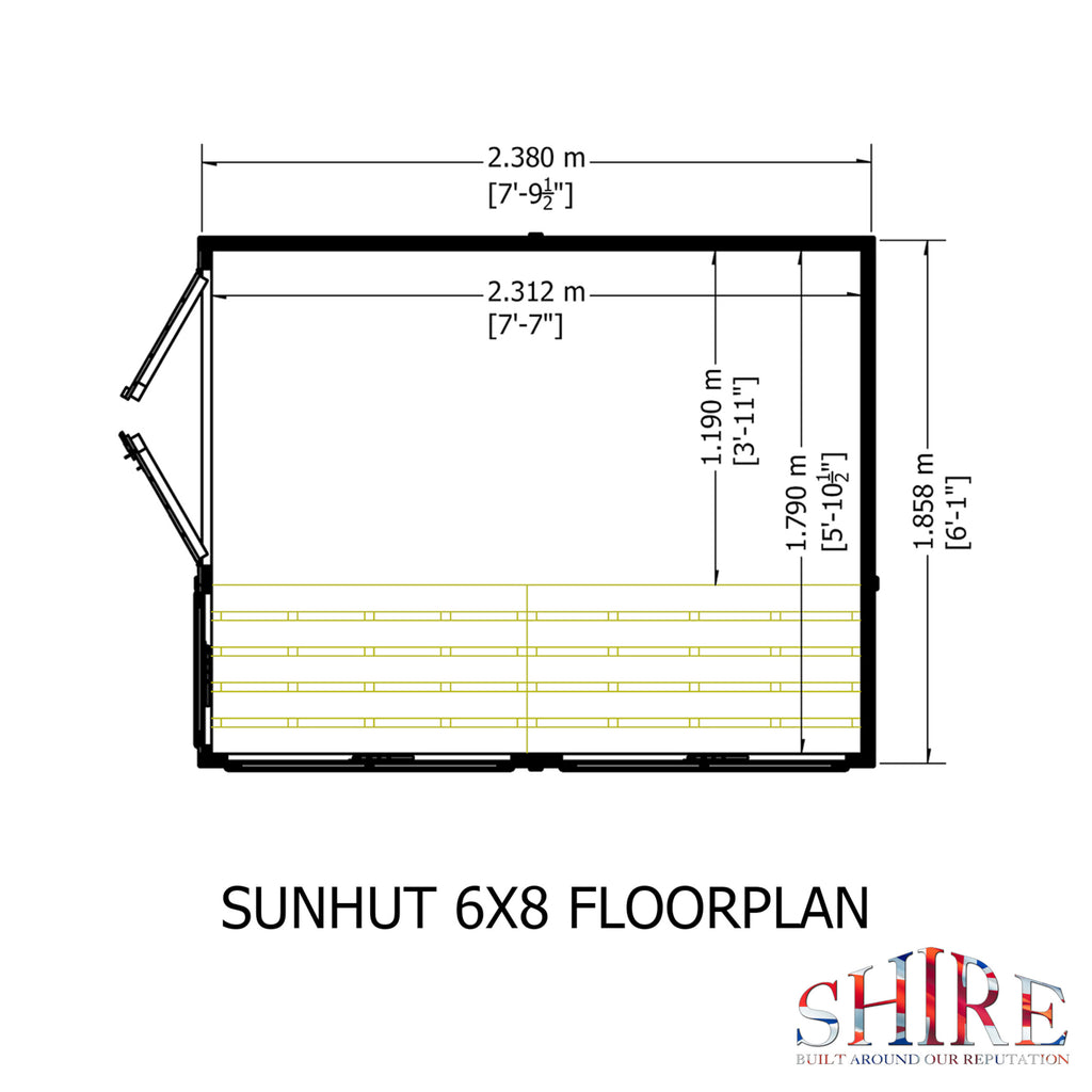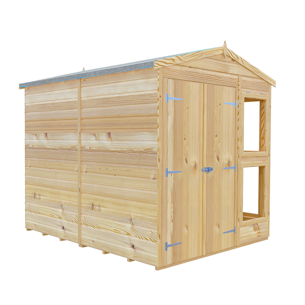An extremely attractive potting shed complete with a handy bench; as its name suggests the Sun Hut is designed for maximum light! Glazed with toughened glass, the top windows are opening. The shiplap cladding is 12mm slow grown, very high grade FSC approved pine on sturdy 34mm square framing with both floor and roof also in T&G. The framed double door is fitted with a padbolt. The shed has been dipped with a base coat preservative ready for you to top coat to your own preference.