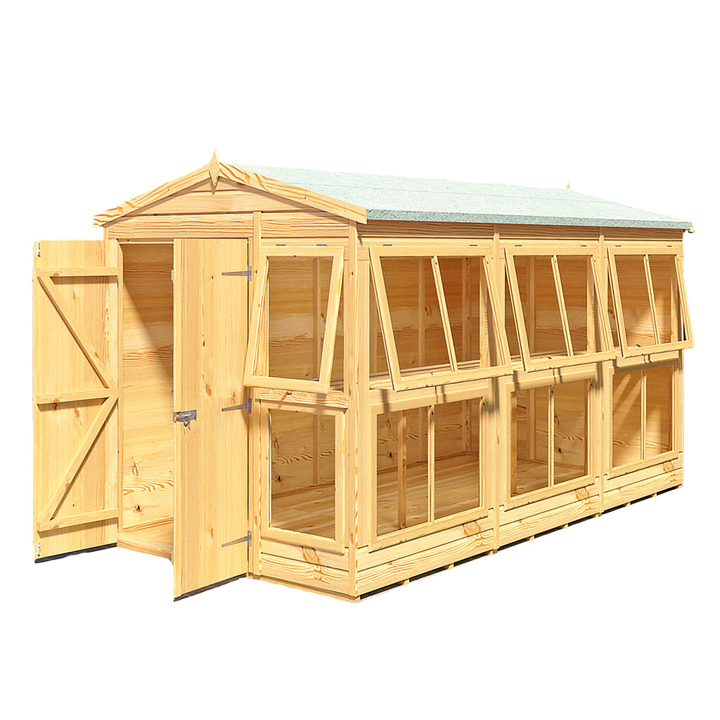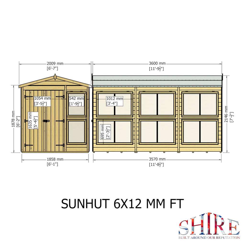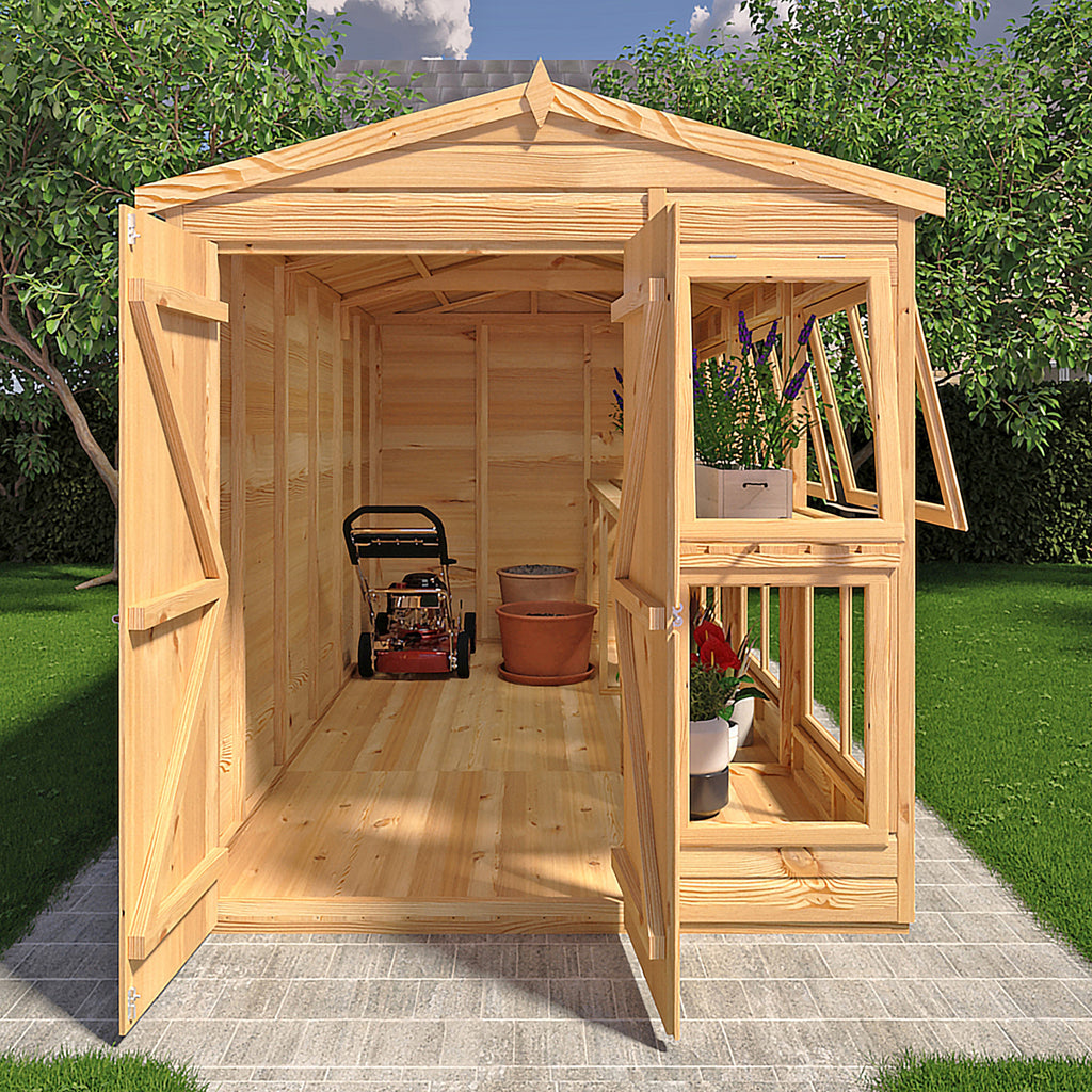 An extremely attractive potting shed complete with a handy bench; as its name suggests the Sun Hut is designed for maximum light! Glazed with toughened glass, the top windows are opening. The shiplap cladding is 12mm slow grown, very high grade FSC approved pine on sturdy 34mm square framing with both floor and roof also in T&G. The framed double door is fitted with a padbolt. The shed has been dipped with a base coat preservative ready for you to top coat to your own preference.