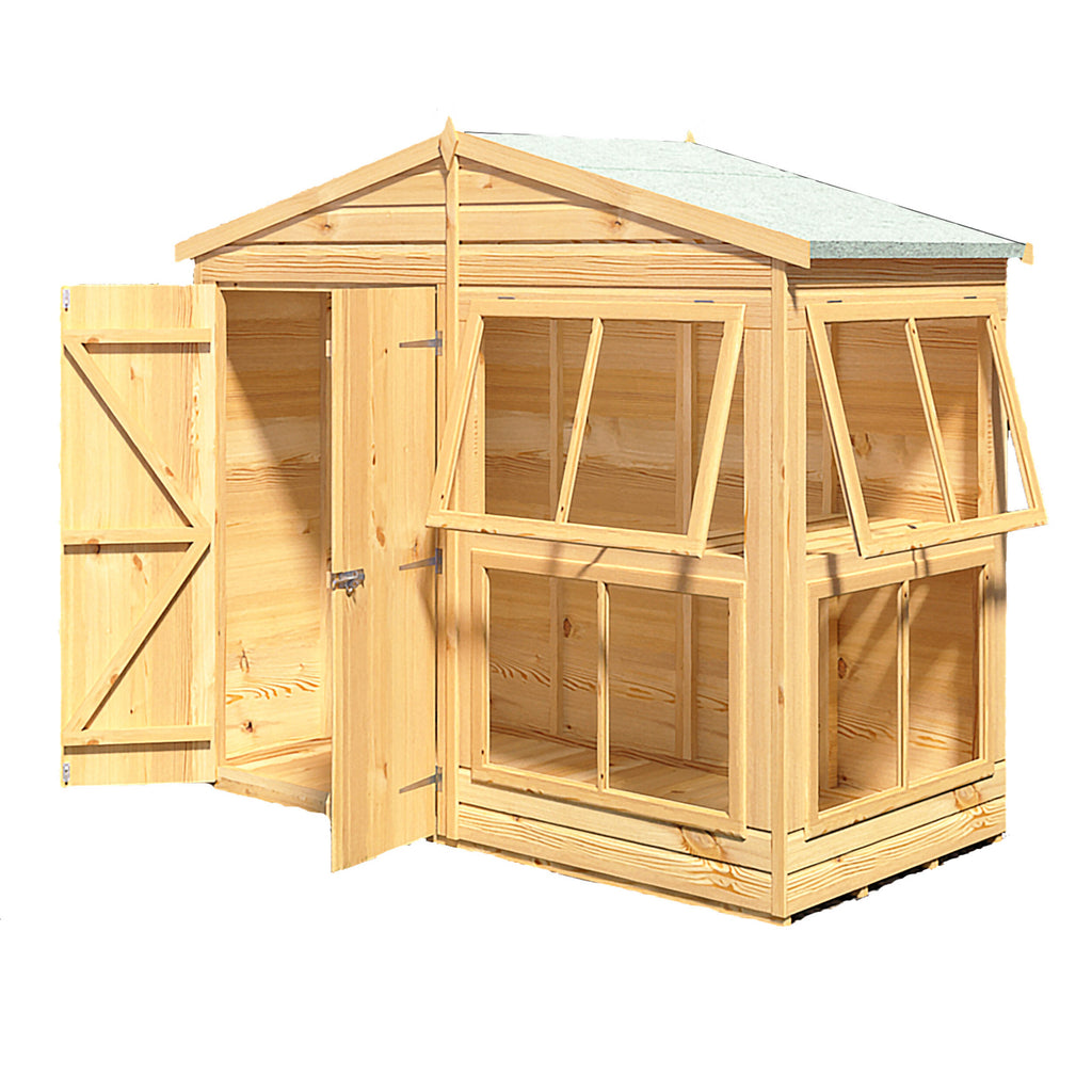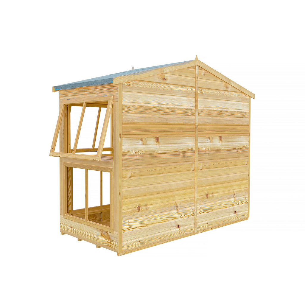An extremely attractive potting shed complete with a handy bench; as its name suggests the Sun Hut is designed for maximum light! Glazed with toughened glass, the top windows are opening. The shiplap cladding is 12mm slow grown, very high grade FSC approved pine on sturdy 34mm square framing with both floor and roof also in T&G. The framed double door is fitted with a padbolt. The shed has been dipped with a base coat preservative ready for you to top coat to your own preference.