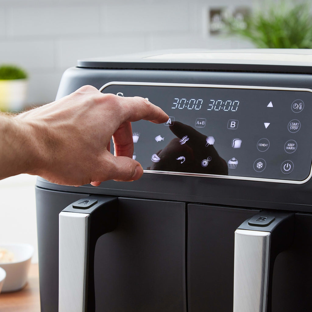 DUAL ZONE BASKETS FOR MAXIMUM EFFICIENCY: Featuring 2 independent cooking zones so you can effortlessly rustle up a variety of meals. Each basket has a four-litre capacity, perfect for making a feast for all your family and all social occasions.