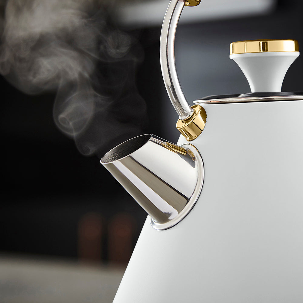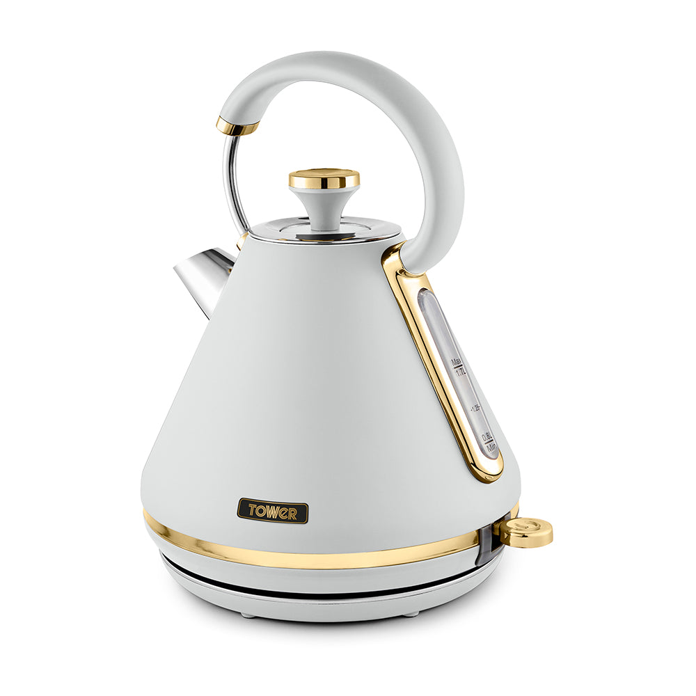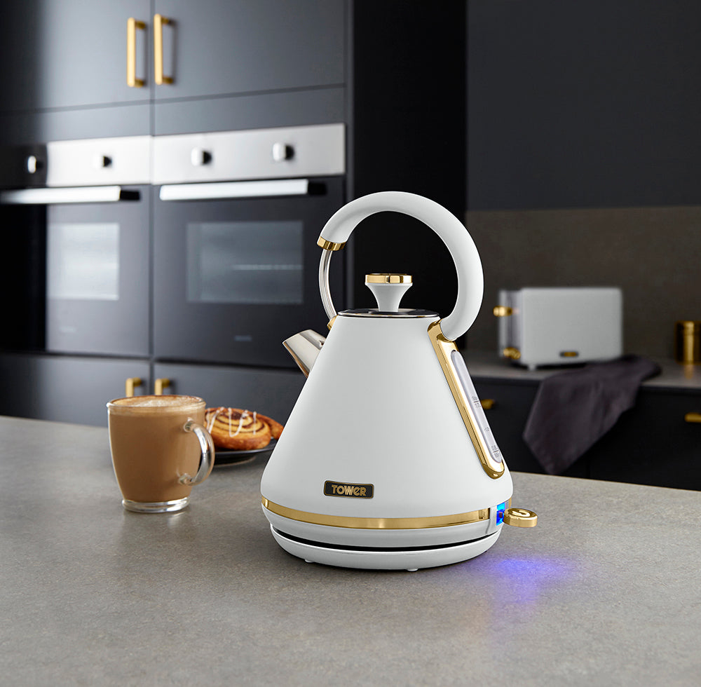Add contemporary style to your kitchen with this elegant Cavaletto Pyramid Kettle from Tower. It features a matte jade finish with lustrous champagne accents, making this kettle an eye-catching addition to any countertop. Full of modern functionality, it's powered by rapid boil technology to reduce your wait for a delicious hot drink, boiling 1 cup in less than 45 seconds. A large 1.7L capacity lets you make up to 7 drinks from a single fill, ideal for families and busy households alike. With a detachable filter, you can easily remove and rinse away limescale to keep your coffee and tea tasting its best. The perfect pour spout protects against boiling hot water spillages, while the 360-degree swivel base and fully-removable lid make it simple to lift and refill the kettle no matter whether you're left or right-handed.