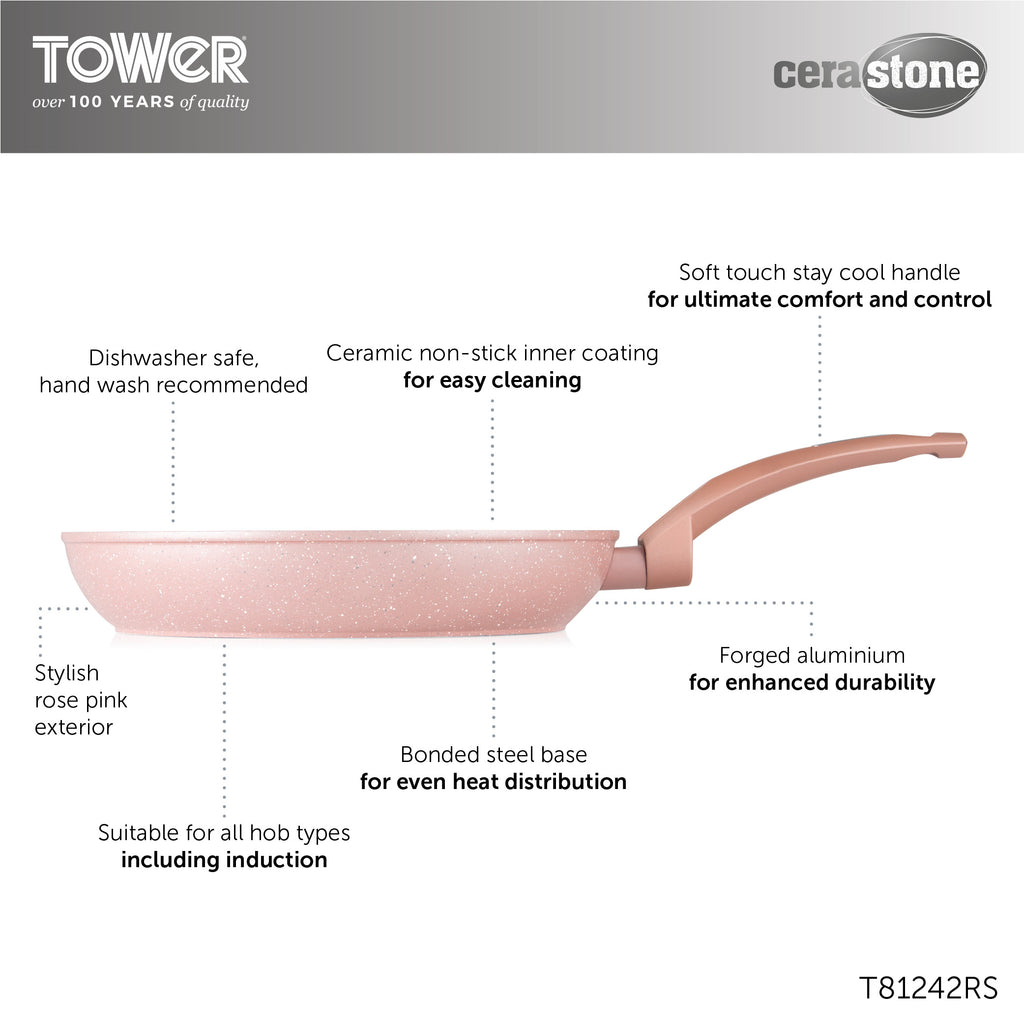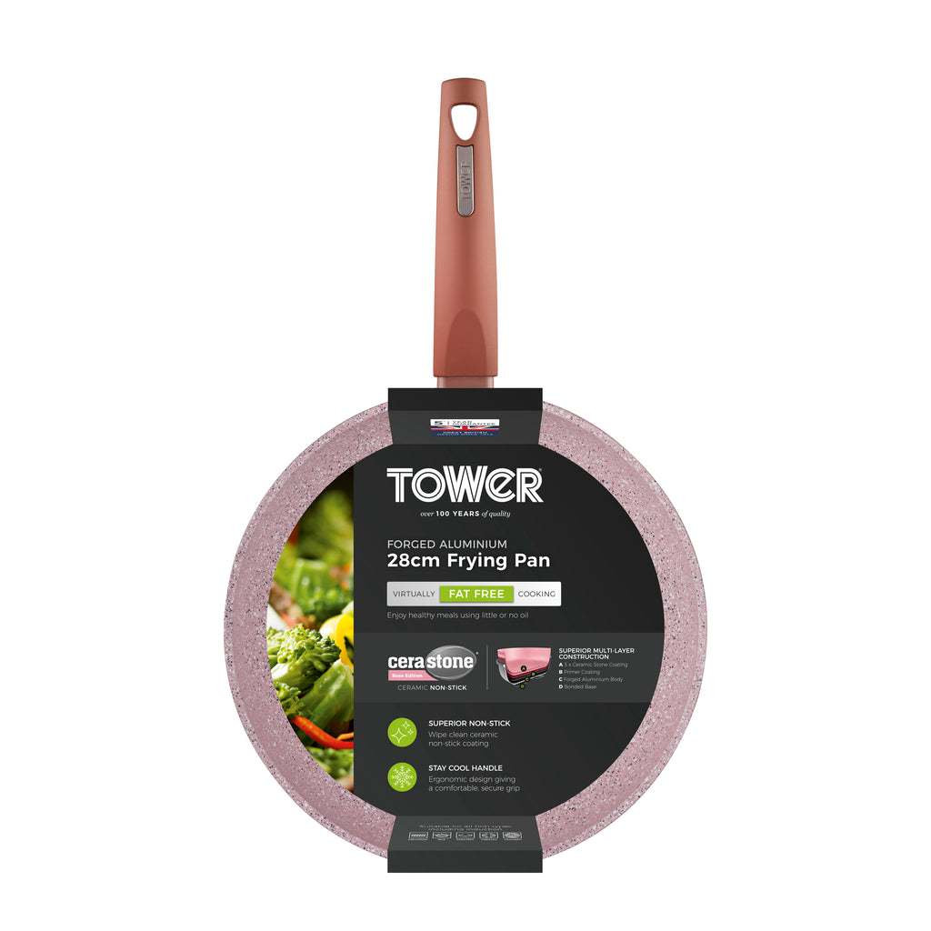 Cook deliciously hearty fry-ups, healthy stir-fry dishes and fluffy pancakes with the Tower 28cm Forged Frying Pan. Featuring high-grade non-stick technology, the Cerastone coating is 5x stronger than other non-stick coatings, and is PFAS, PFOA, PTFE, Lead and cadmium-free so you can enjoy healthy meals using little or no oil. Its high quality, long-lasting forged aluminium body enables quick and easy adjustment of temperatures for more efficient cooking results, with no hot spots. The frying pan has a softtex handle for comfortable control over your cooking. Its bonded steel base provides even heat distribution to ensure your food is cooked thoroughly, and is designed to work with any hob type including induction. The non-stick ceramic coating prevents food from sticking to the surface, and this frying pan is dishwasher safe for an even easier clean after cooking. Collect the full Cerastone range for all your best loved dishes, with 100% recyclable product and packaging.