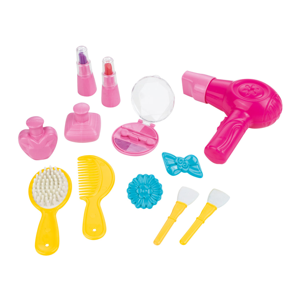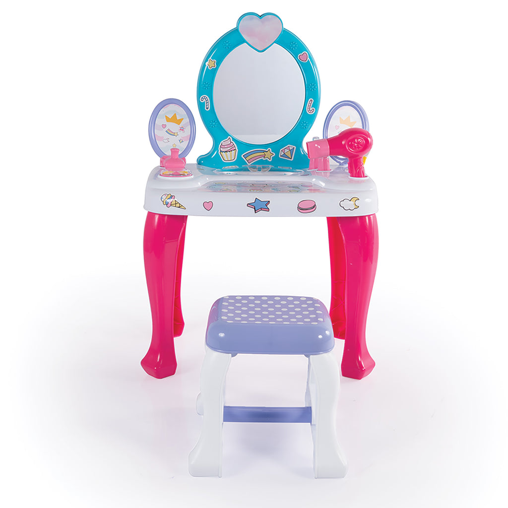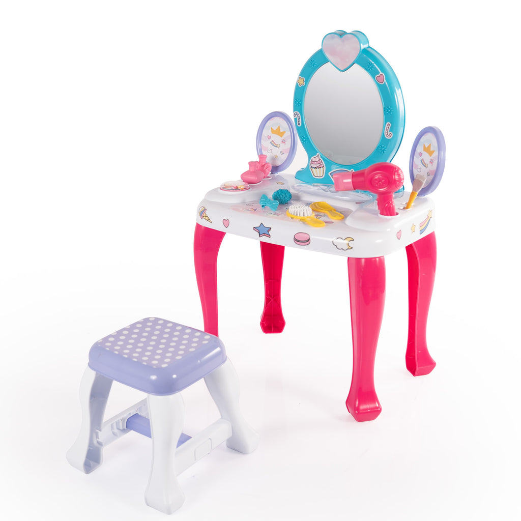 Introducing the deluxe vanity table for your little one - designed for children aged 36 months up to approx. 6 years. This delightful set comes complete with an array of accessories to spark creativity and role-play. Inside, your child will discover 2 lipsticks, 1 hairdryer, 2 perfumes, 1 stool, 1 eyeliner, 2 hair clips, 2 combs, and 2 blush brushes.