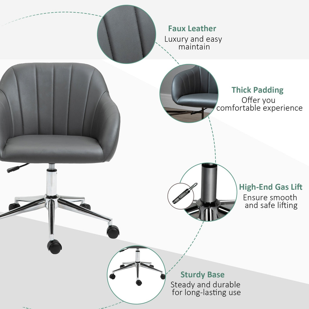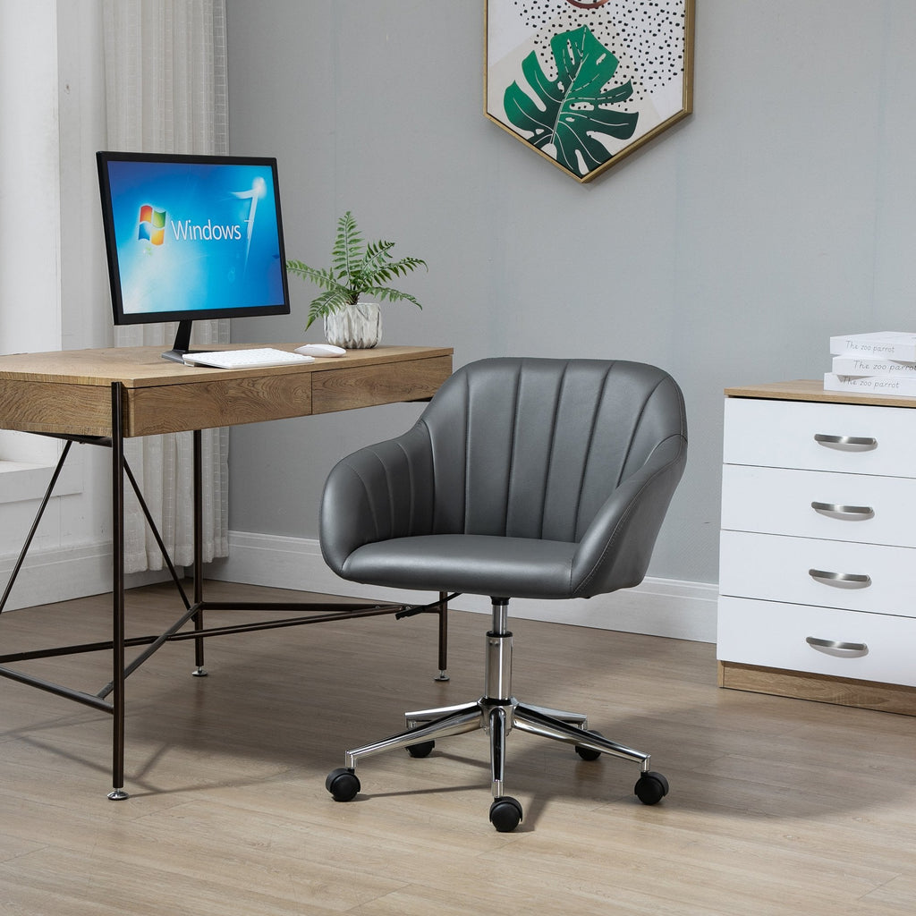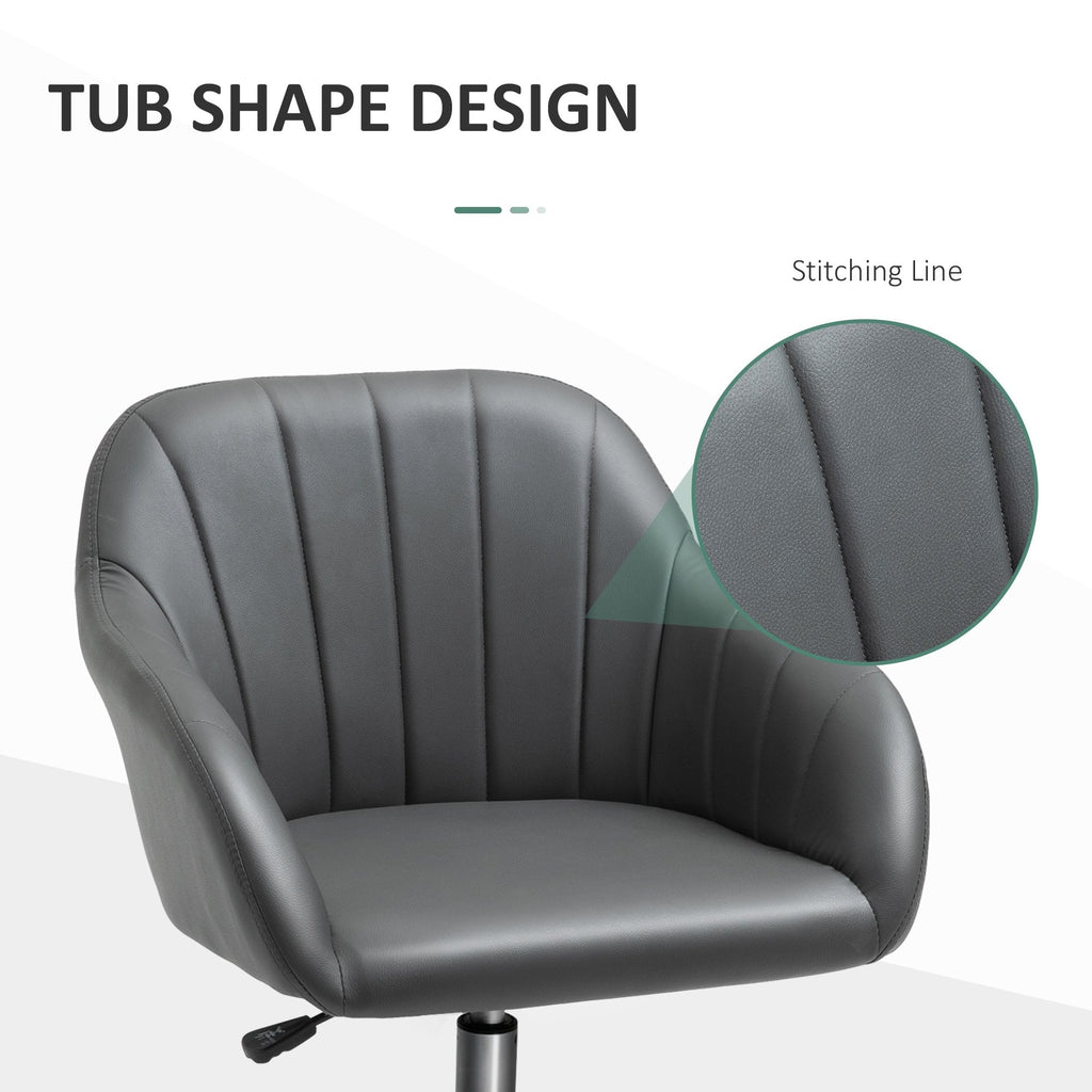 Create a stylish backdrop to your working times with this chair from Vinsetto. A tub shape, the seat is wrapped in faux leather for a sleek look, with the sloping curves giving it a relaxed look. Ergonomic design includes a high back and armrests, swivel seat and five wheels on the base. Height is adjustable too. Finished with line stitching on the back for extra detail.